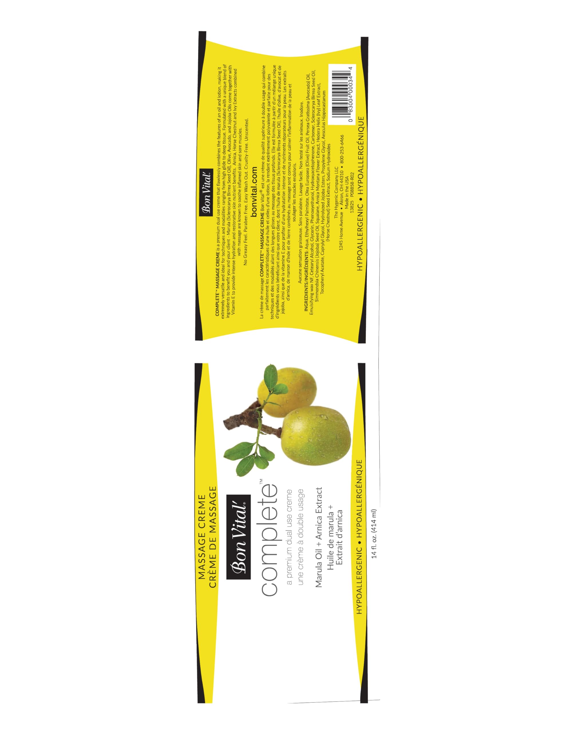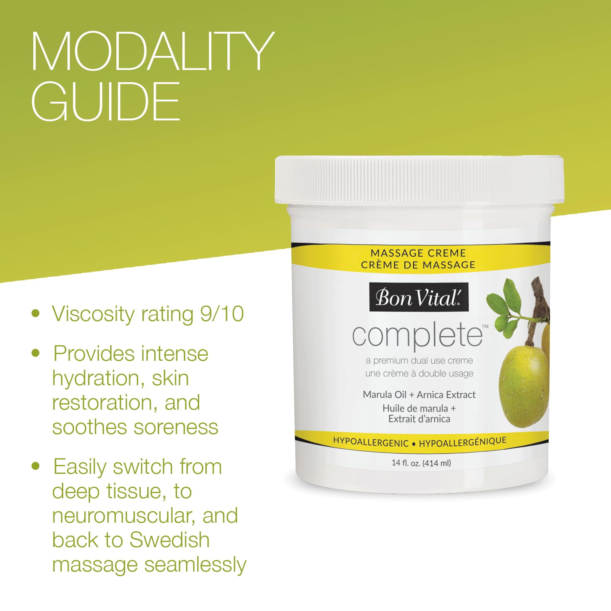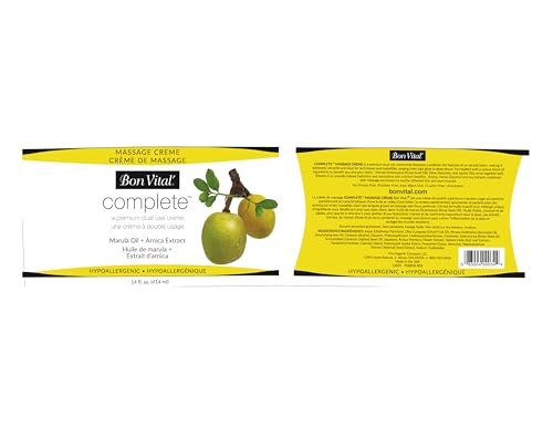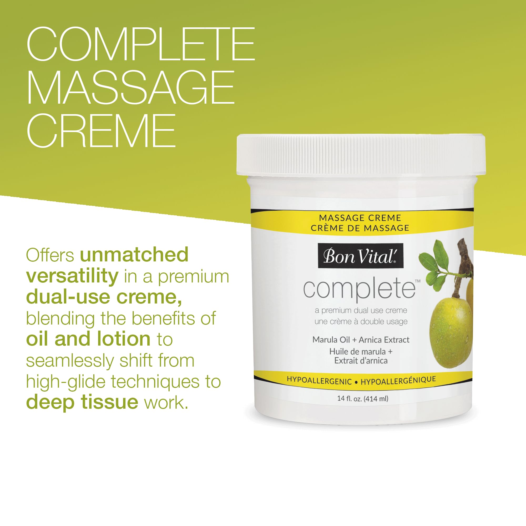 COMFORT YOU CAN FEEL. PERFORMANCE YOU CAN TRUST Bon Vital Complete Massage Creme brings together the best of nature and science for a massage experience that’s both luxurious and practical. Whether you're a licensed therapist or a home user, this dual-purpose formula is designed to perform. MOISTURE-RICH, NEVER GREASY Infused with skin-loving oils like marula, olive, avocado, and jojoba, this cream delivers deep hydration without the slick or sticky feel. Your hands will glide effortlessly while your clients enjoy smooth, soft, comfortable skin post-session. MADE FOR SENSITIVE SKIN Fragrance-free and hypoallergenic, it’s gentle enough for even the most sensitive clients. No overpowering scents. No parabens. Just a clean, nourishing cream that puts comfort first. EFFORTLESS APPLICATION Creamy yet clean, it supports long glide times, minimizes interruptions, and allows for complete focus on client care. From facials to full-body work, it’s your go-to for reliable performance.