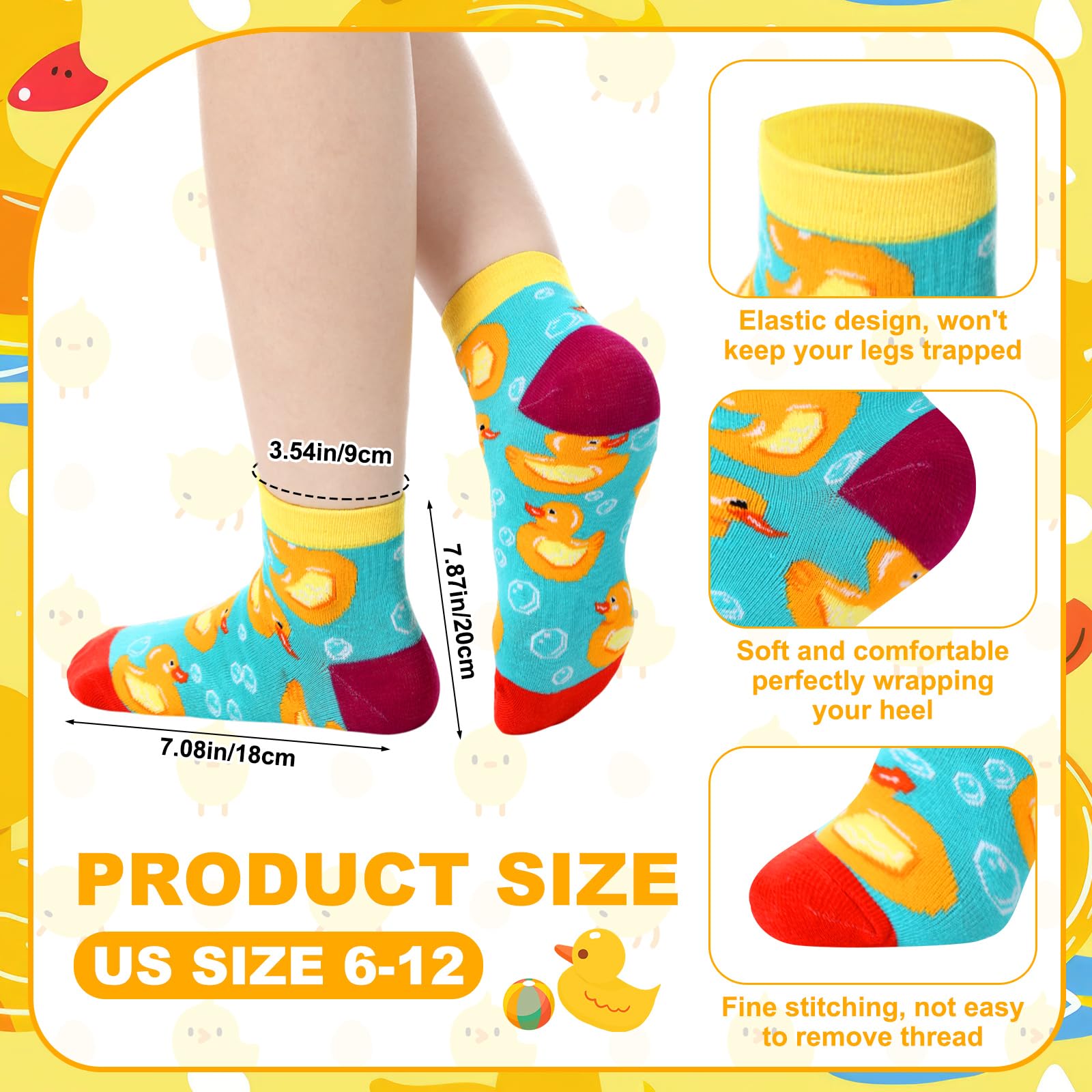 Specific Size: the size of these yellow duck socks is US size 6-12, with good elasticity, ideal for most male and female adults and teenagers, and can comfortably fit most foot types, bringing you a pleasant wearing experience