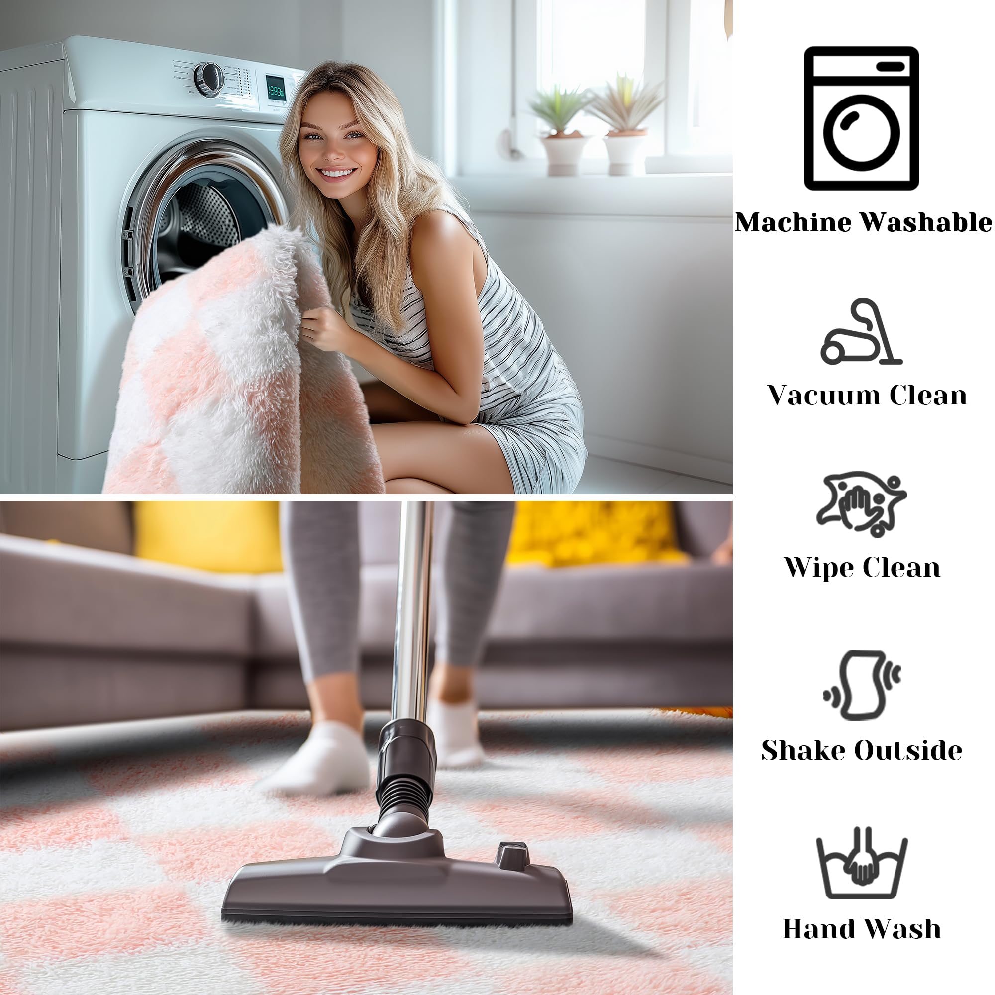 Easy to Clean Plush Area Rug -- Wipe the fuzzy rug with rag or clean it with a low-power vacuum, or shake outside, or hand wash the furry rug with cold water or mild-cleaner, and place it in a ventilated place to air-dry. Please Note: Do not wash the soft rug by machine, bleach, tumble dry, or iron. Because of vacuum packaging, there will be some creases and not fluffy enough when you first open it, lay it flat for 2 to 3 days and it will be recover fluffy.