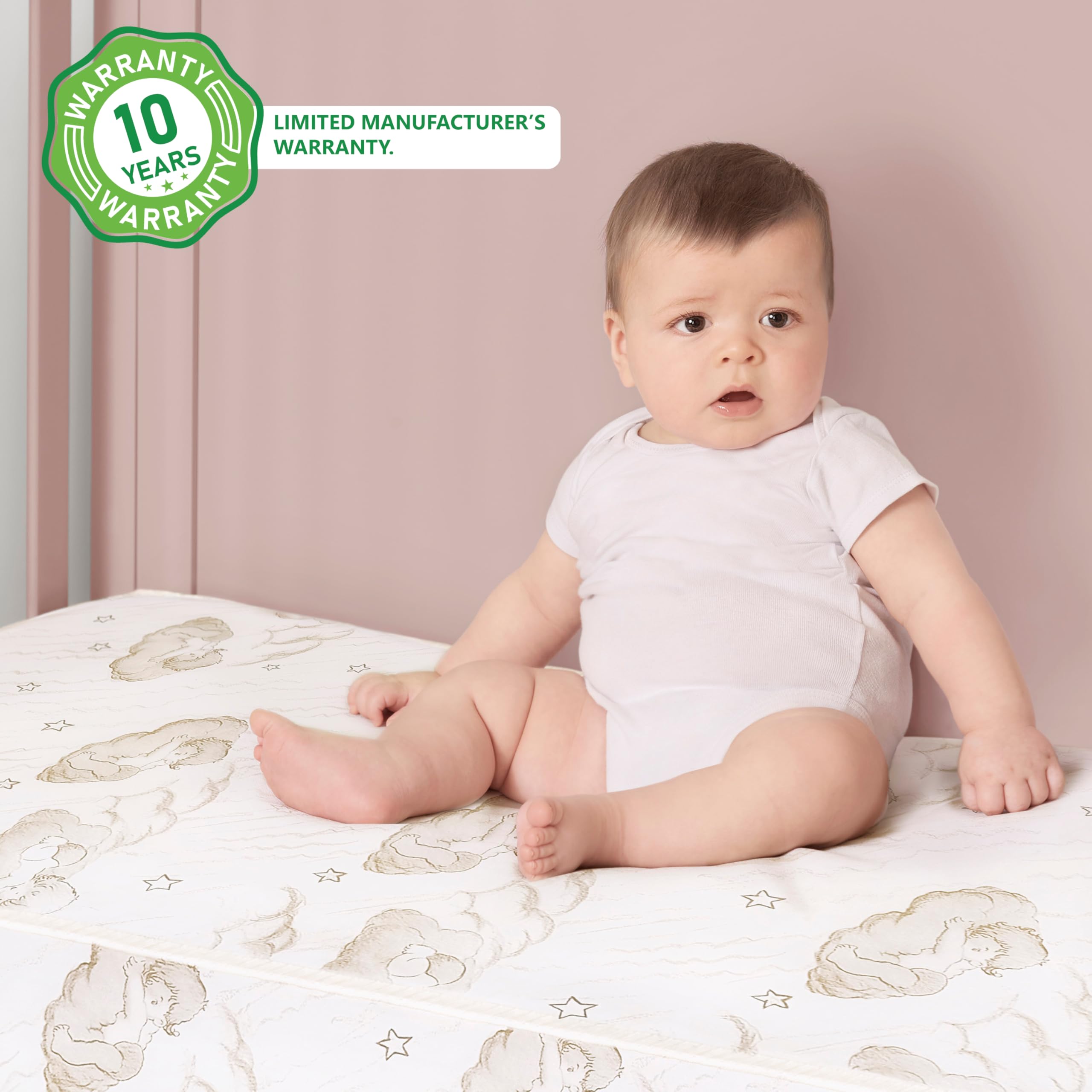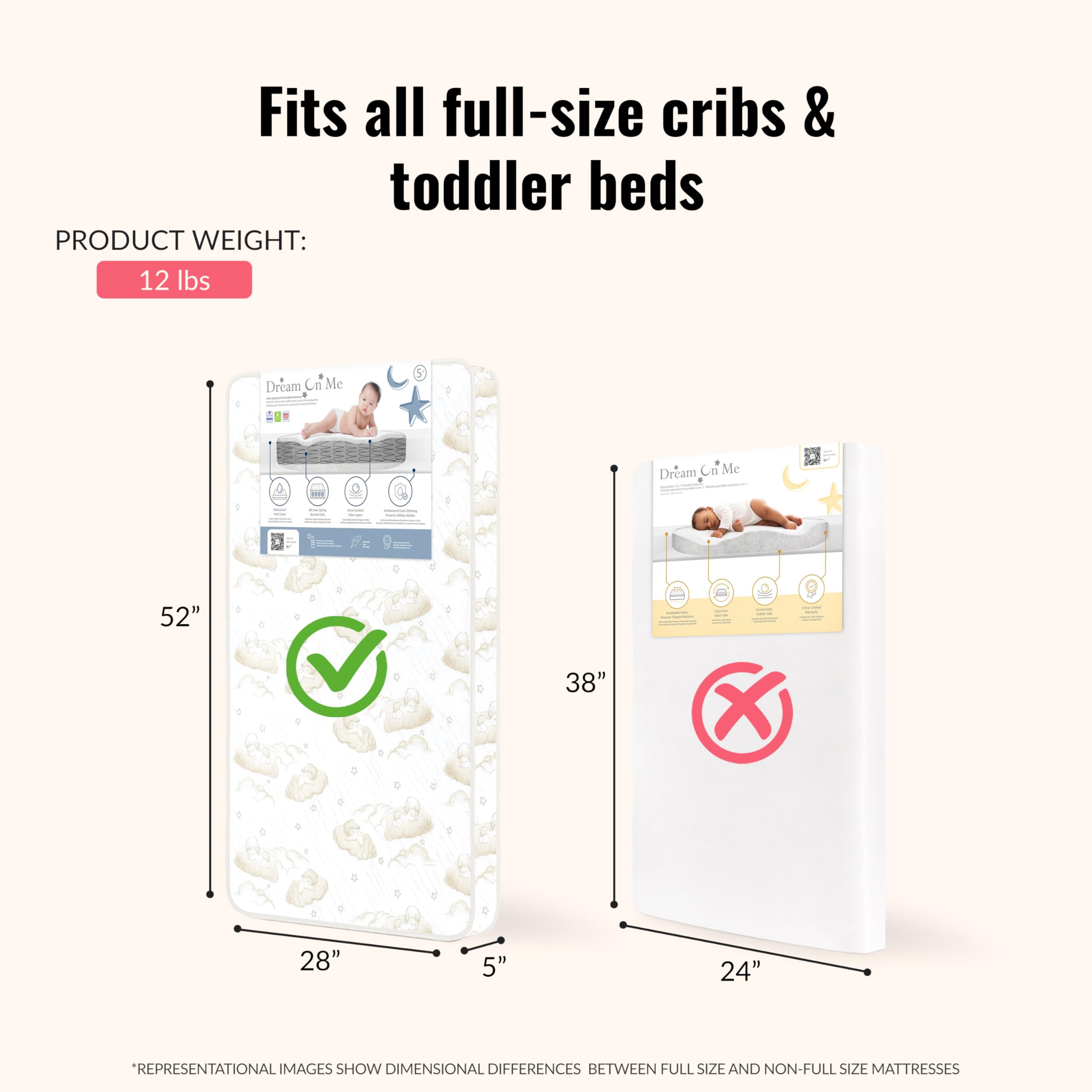 PROD SPECS: Fits all standard size cribs and toddler beds for years of use, comes with 10- Year Warranty Manufacturer’s warranty. Dimensions: 52L X 28W X 5H inches