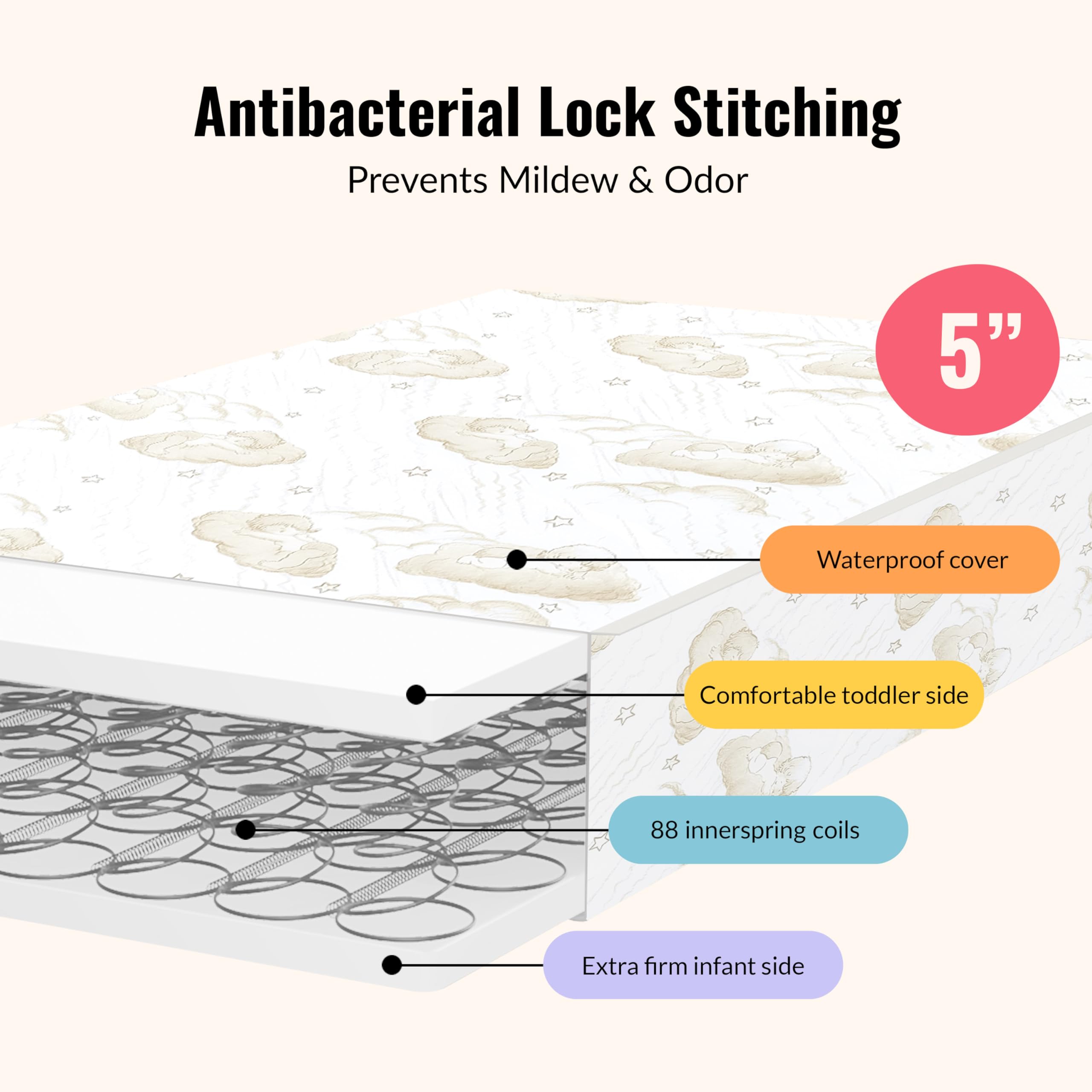 EXTRA FIRM & SUPPORT: The mattress 88 interwoven, heat tempered coils, 6-gauge steel border wire around perimeter of mattress offers a firm foundation and excellent support to meet the needs of your sleeping baby.General Note: Please allow 24 - 72 hours for your Mattress to regain its full shape. Any memory foam will expand faster in a warmer room. In cold temperature, at delivery, your mattress may take a bit longer to return to full sized from its compressed state.The expansion time of the mattress will vary as per the surrounding