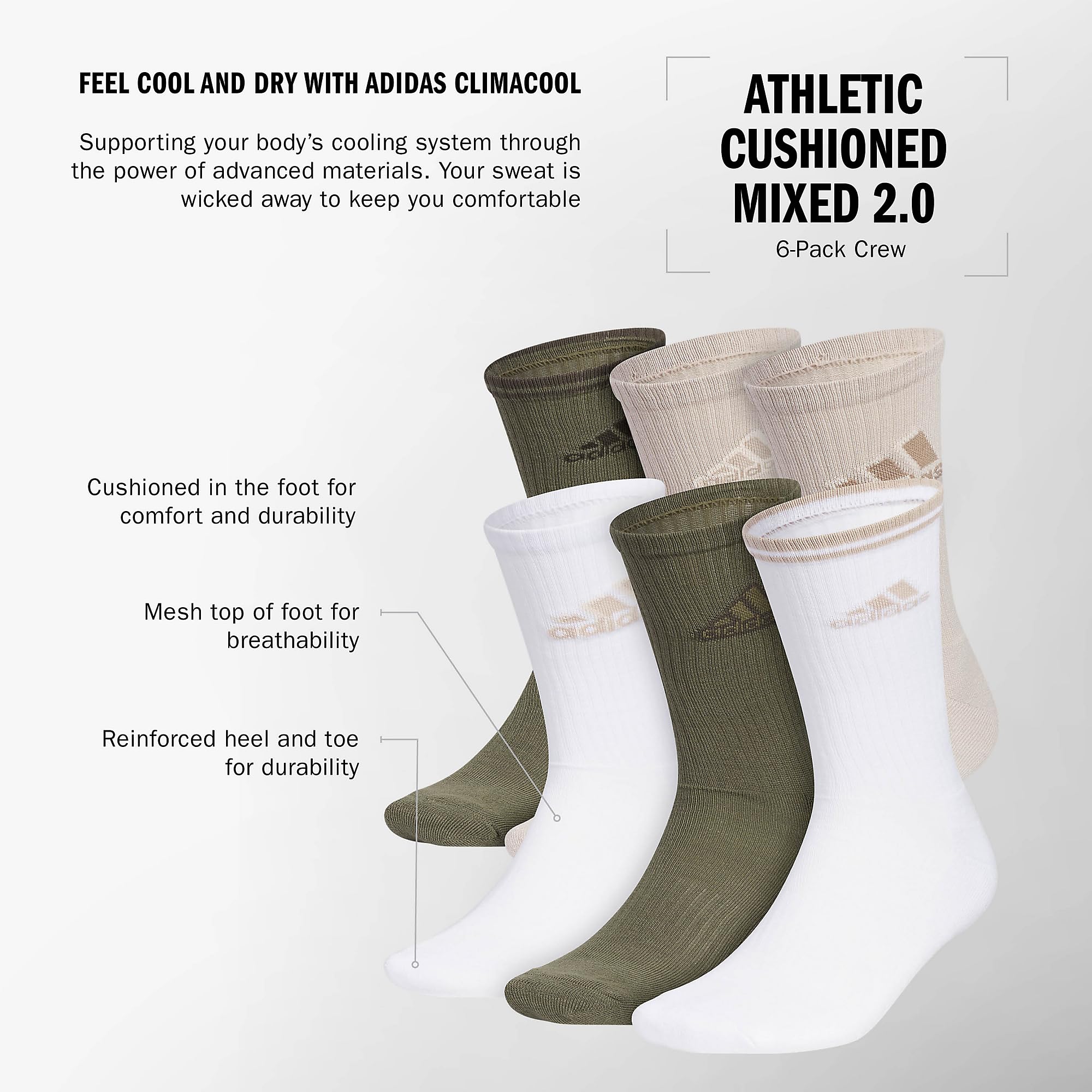 Description Discover a blend of comfort and performance with adidas Men's Athletic Cushioned Crew Socks. These mens socks come with arch compression for a secure fit, making them ideal as arch support socks. Whether you're searching for running socks men or long socks for men, this six-pair pack offers versatility and durability. Crafted from moisture-wicking yarns, these athletic socks for men keep feet dry, giving a comfortable experience all day. The cushioned foot provides extra comfort, while the secure fit supports daily activities, making them suitable as men socks. Experience comfort with a thoughtful design and durability to support your active lifestyle. Whether for everyday wear or intense athletic routines, adidas delivers quality mens socks to meet every demand.