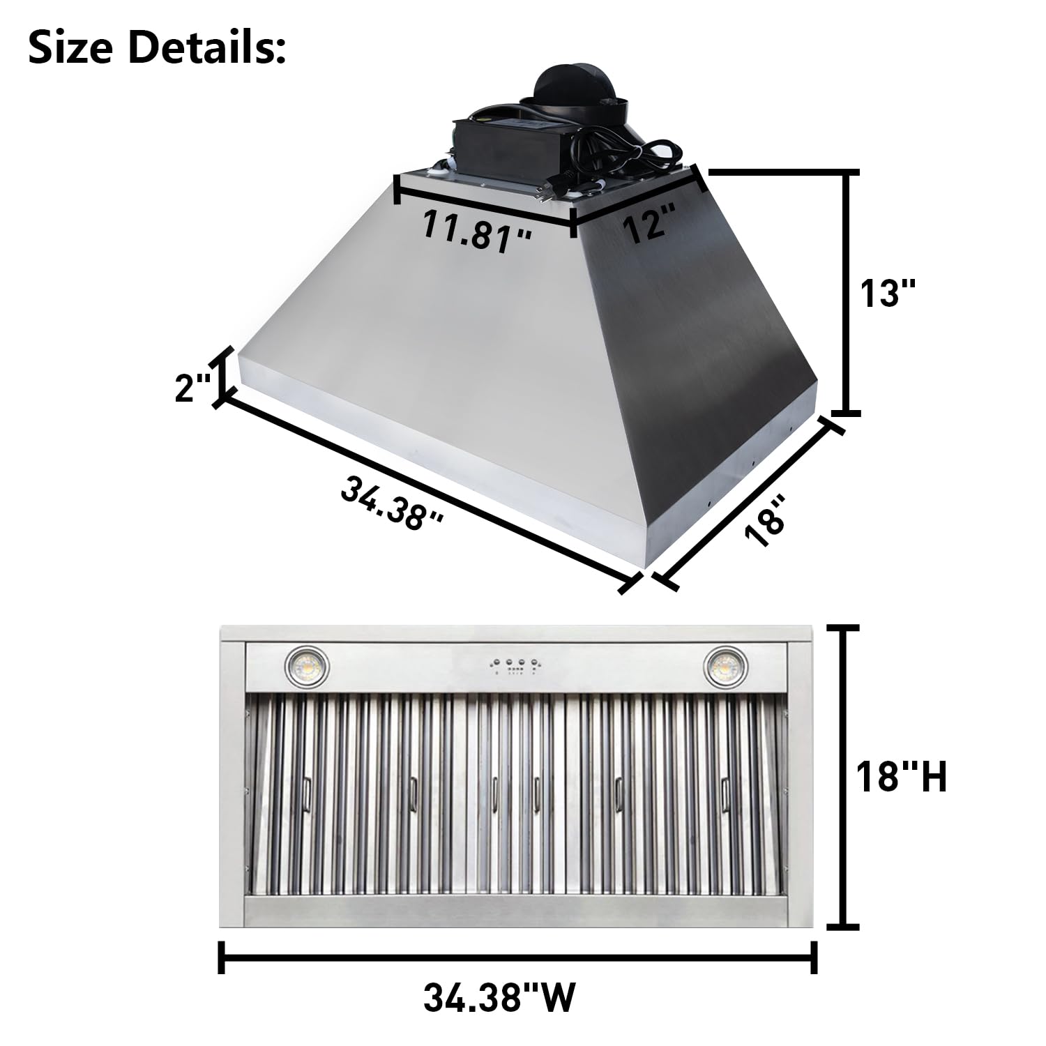 Product Dimensions(L x W x H): 34-3/8 in x 18 in x 13 in.Duct: 6" round. Please refer to our Size Measurements before placing an order.