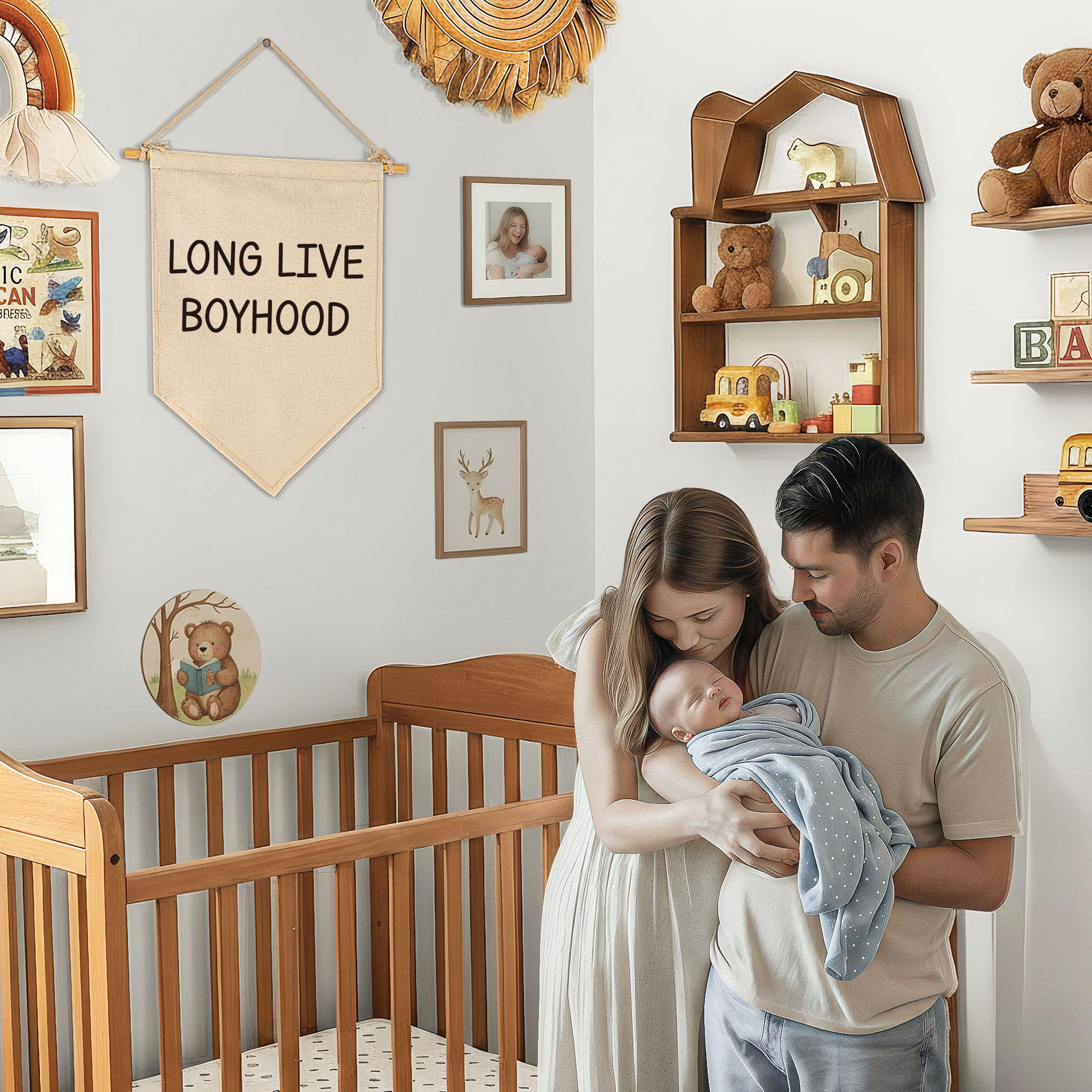 This natural beige cotton canvas banner features inspiring quotes or cute prints that add instant charm to a nursery, baby room, kid’s room, playroom. It hangs neatly with twine and a wooden stick, no assembly required, just open and hang. Durable and beautifully made,it brings a warm, unique touch to any wall decor and makes a thoughtful gift for baby kids, boys and girls, or your friend’s little ones.Perfect for baby shower, birthday,christmas,or any special day