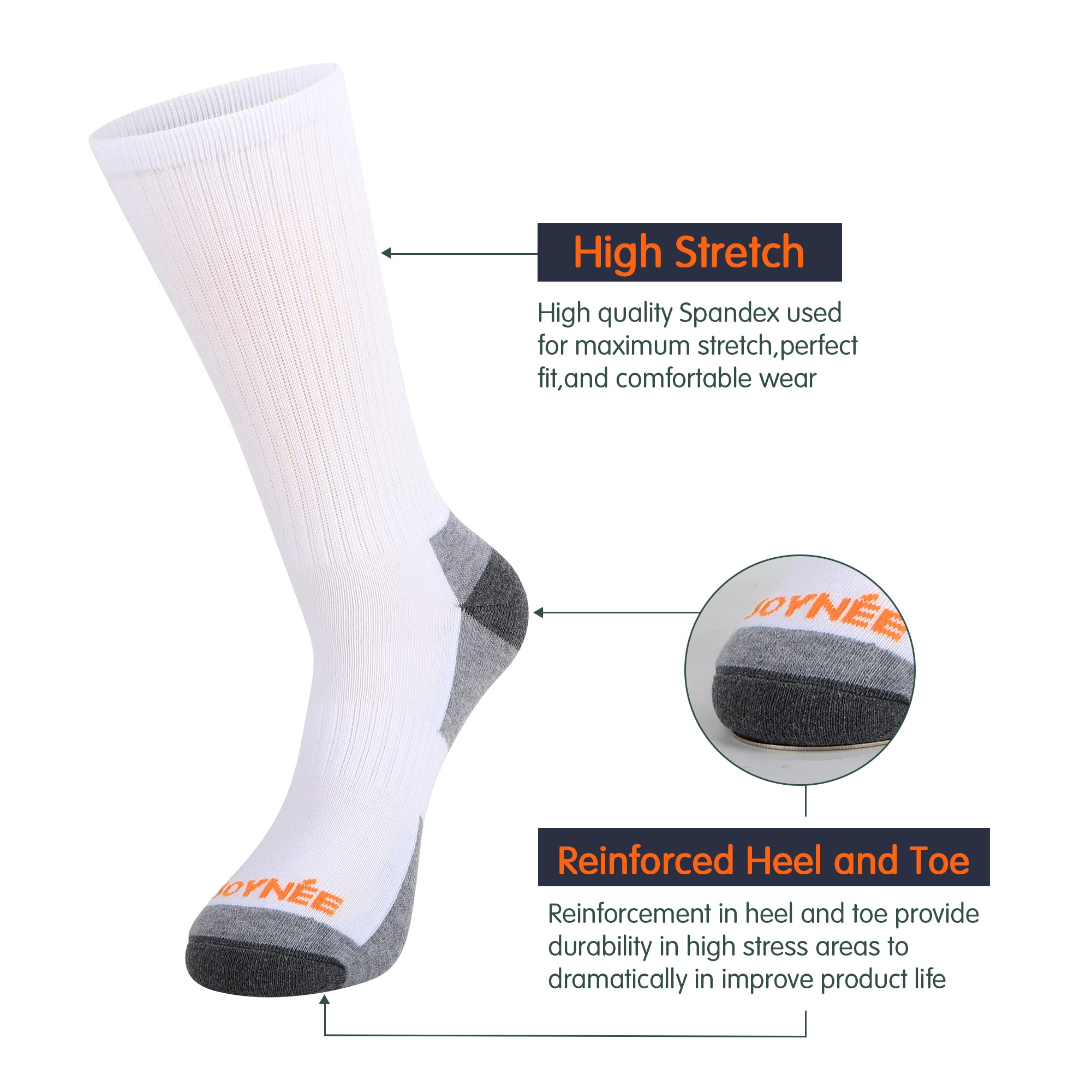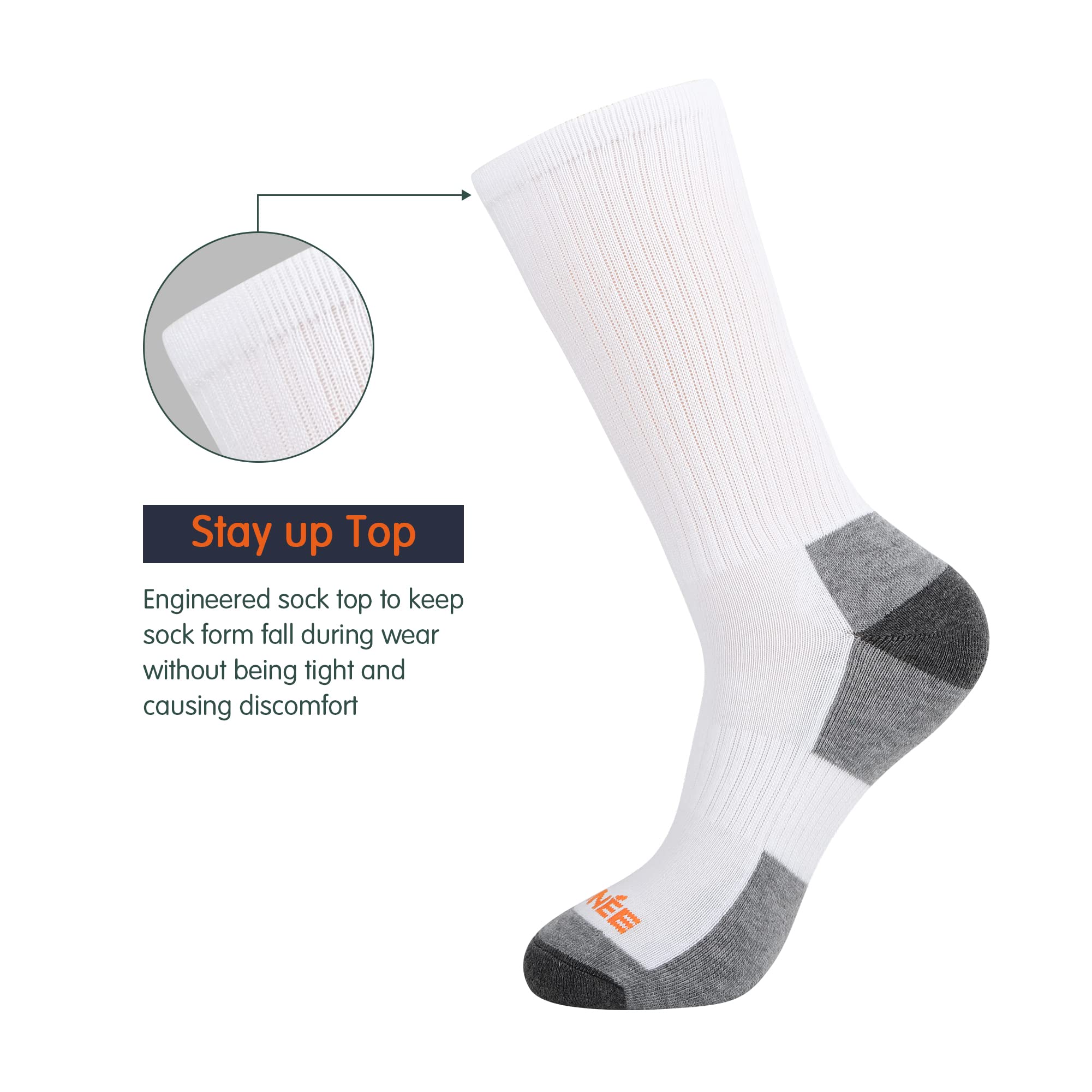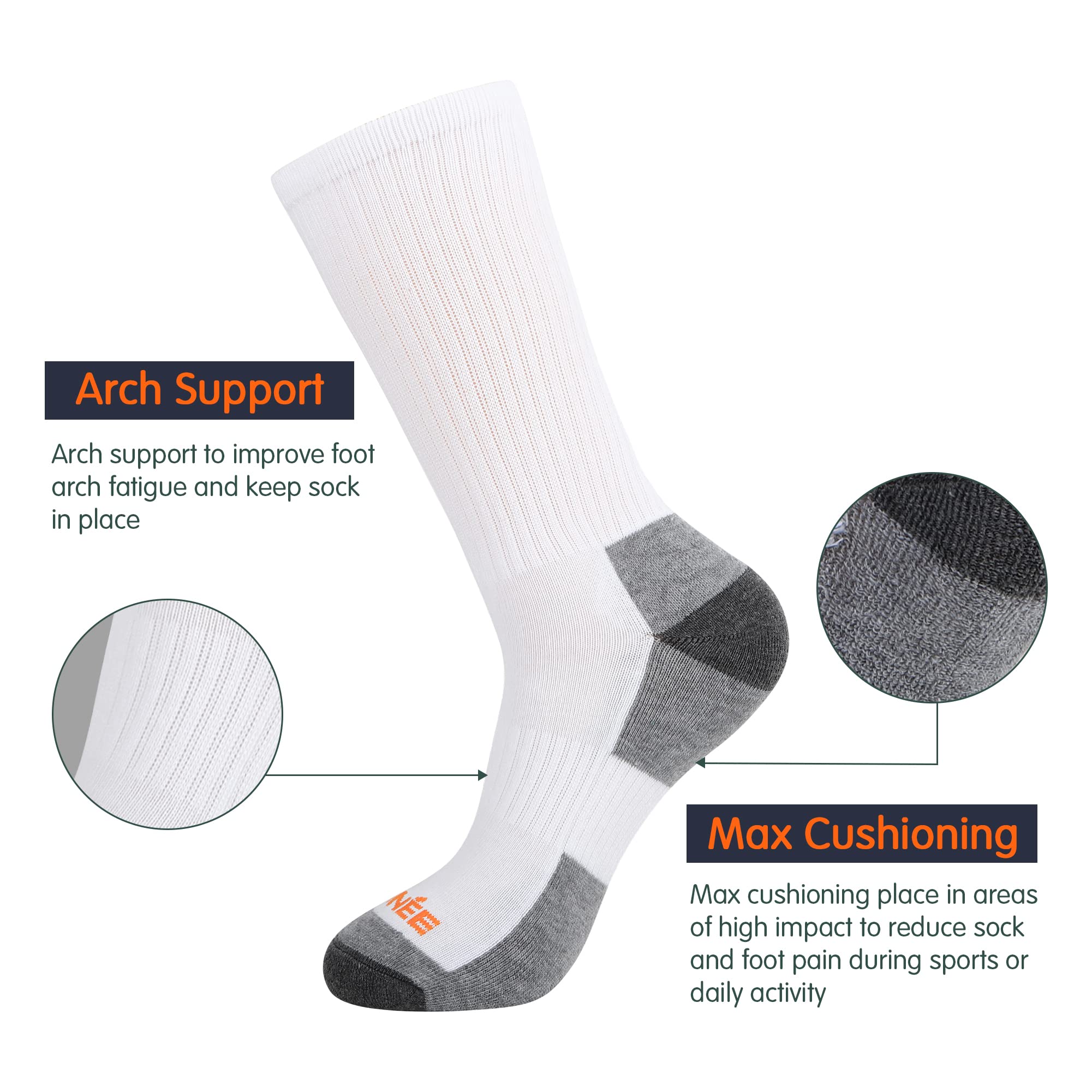 PERFORMANCE: Max Cushioning-Max Cushioning place in areas of high impact to reduce sock and foot pain during sports or daily activity. Deep Heel Pocket-Engineered heel pocket to provide true fit during wear. Arch support-Arch support to improve foot arch fatigue and keep sock in place. Reinforced heel and toe-Reinforcement in heel and toe provide durability in high stress areas to dramatically in improve product life.