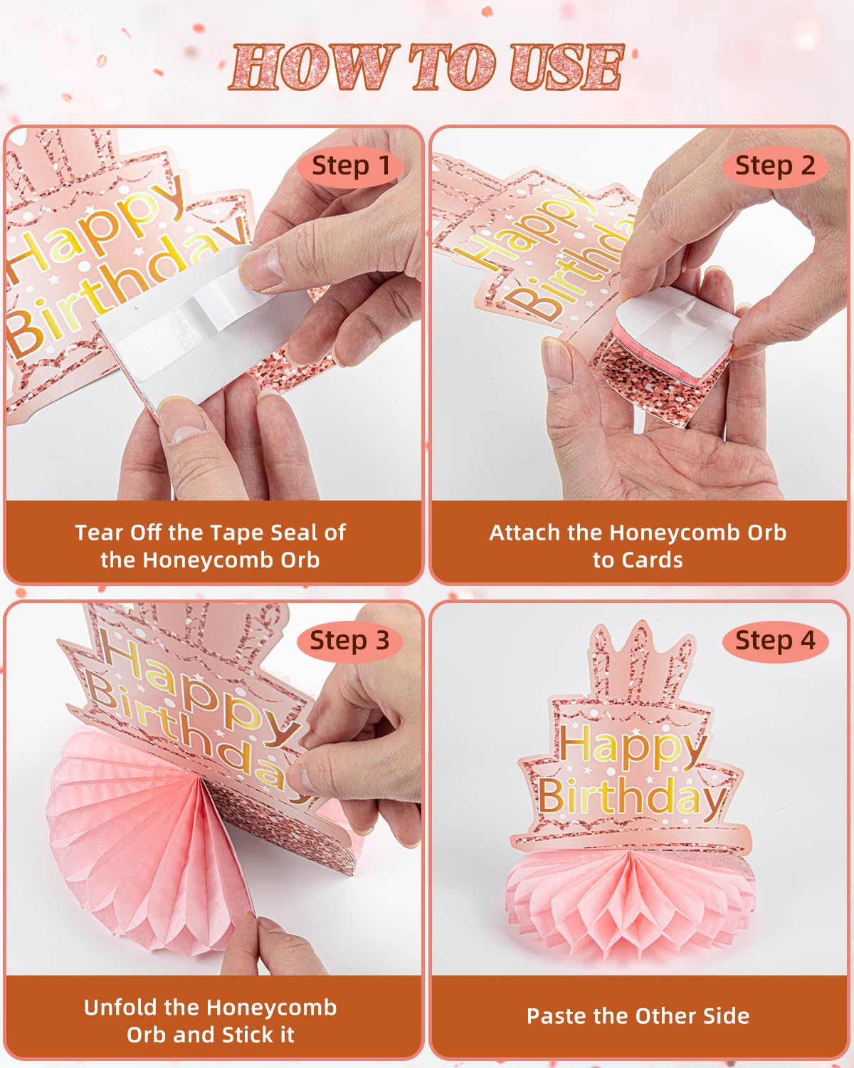 🎉HOW TO USE: Firstly, tear off the sticker of the honeycomb ball, and then stick the honeycomb ball to a fixed area on the card, next step is unfold the honeycomb orb and stick it, finall repeat on the other side of the card and put it stand on the table. It's so easy that you can save a lot of time