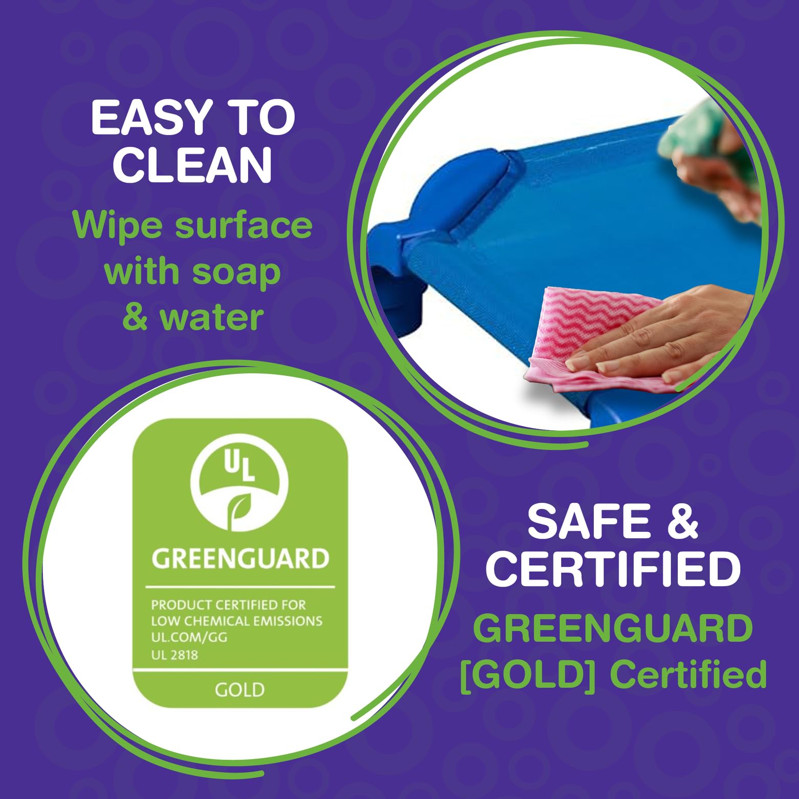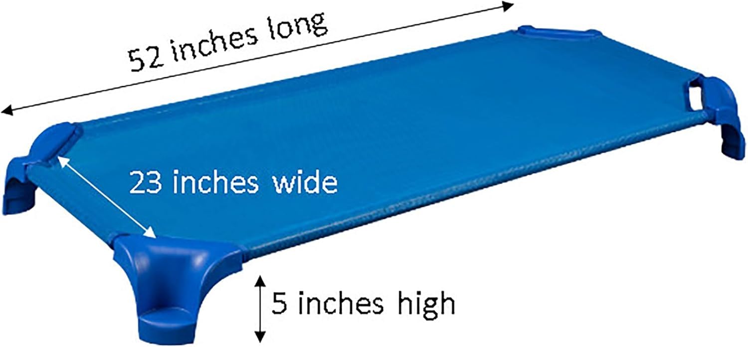 STANDARD SIZE COTS: Each Greenguard Gold Certified children's cot is easy to assemble and measures 52"L x 23"W x 5"H to fit neatly in classrooms or homes without taking up too much space