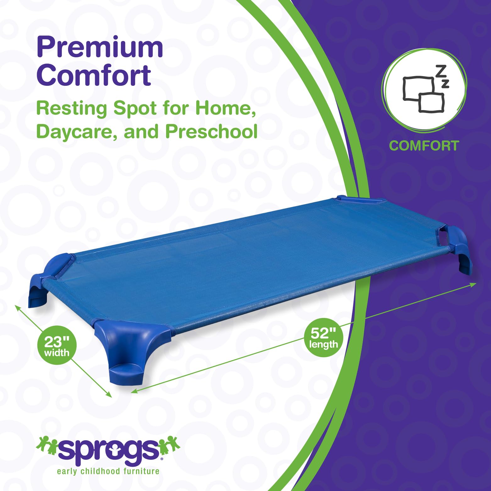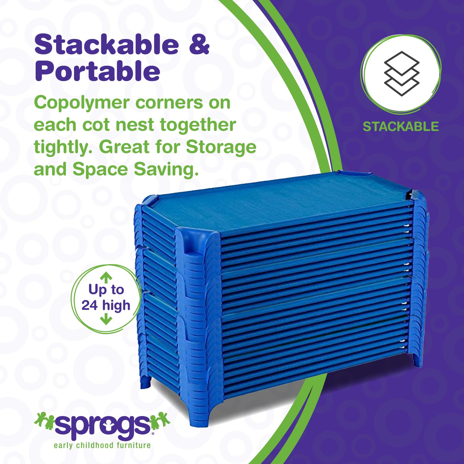 After long hours of play or learning, the Sprogs Stackable Daycare Cots provides your little ones with the perfect place to cozy up and relax for a safe nap. These child-friendly sleeping cots are designed with care to ensure a comfortable napping surface for preschoolers and sleepy toddlers, making them great for classrooms, daycare centers, or any room in your home. For optimal convenience in the classroom, the copolymer corners on each cot nest together tightly to allow you to neatly stack them up to 24 high for compact storage after nap time, and rolling casters (sold separately) can be attached to the bottom of the cots to simplify set up and clean up. The durable, non-flammable mesh fabric with a vinyl coating makes clean-ups a breeze - simply scrub the cot with a damp soapy sponge and wipe it dry. Constructed with a sturdy 18-gauge steel frame, these naptime cots withstand years of heavy-duty use and support up to 150 pounds, and they're backed by a 20-year warranty. Each Greenguard Gold Certified children's cot is easy to assemble and measures 52" L x 23"W x 5"H to fit neatly in classrooms or homes without taking up too much space.