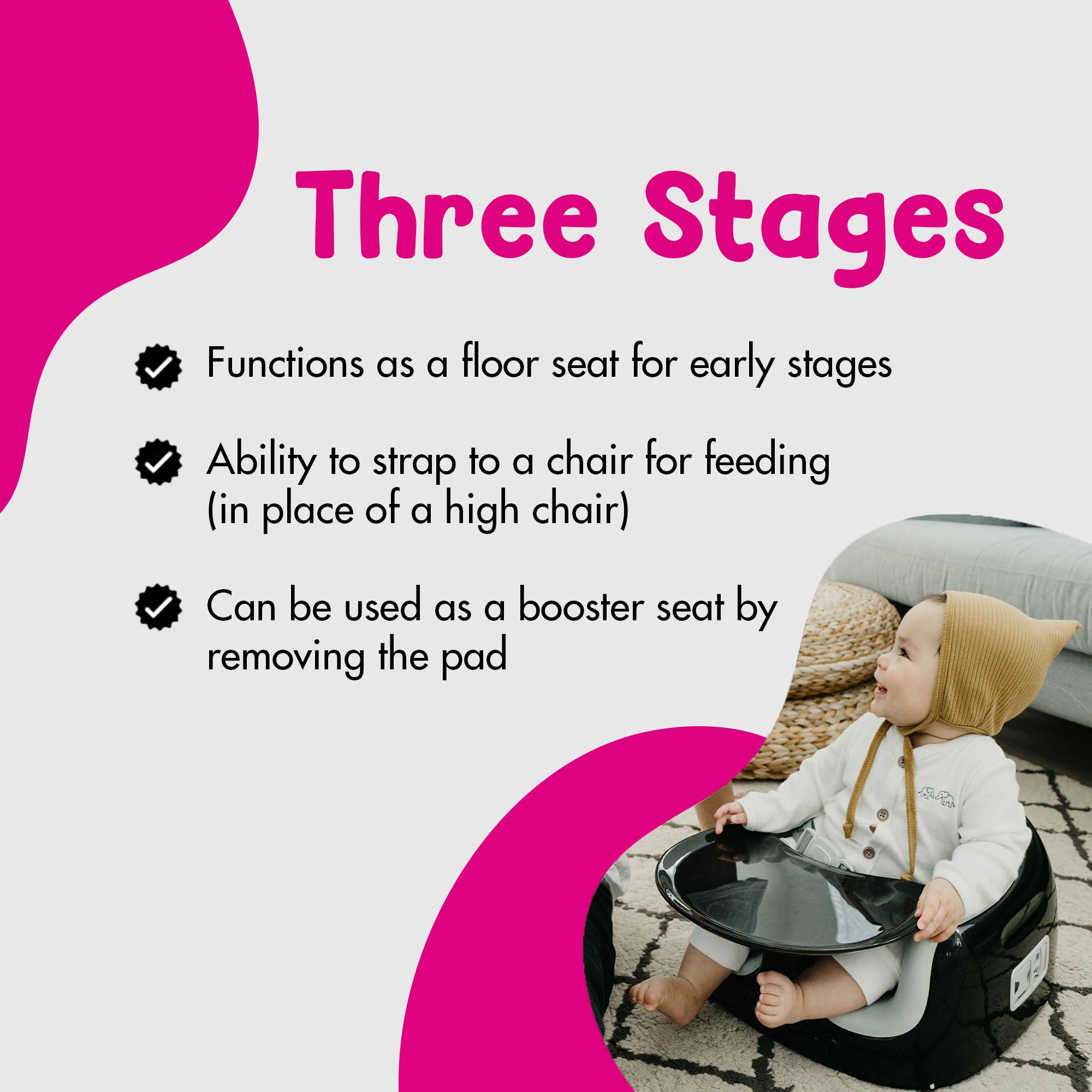 Adaptable 3-in-1 Seat: Set of (2) multi 3-in-1 seats are designed for babies and toddlers between 6 and 36 months old who can sit up unaided