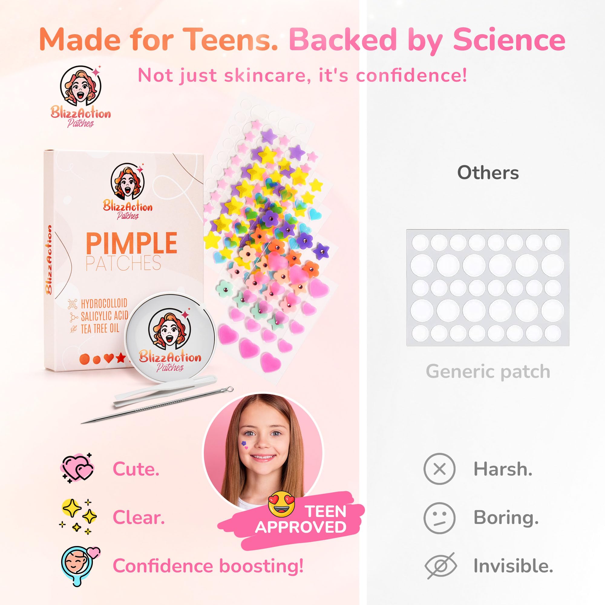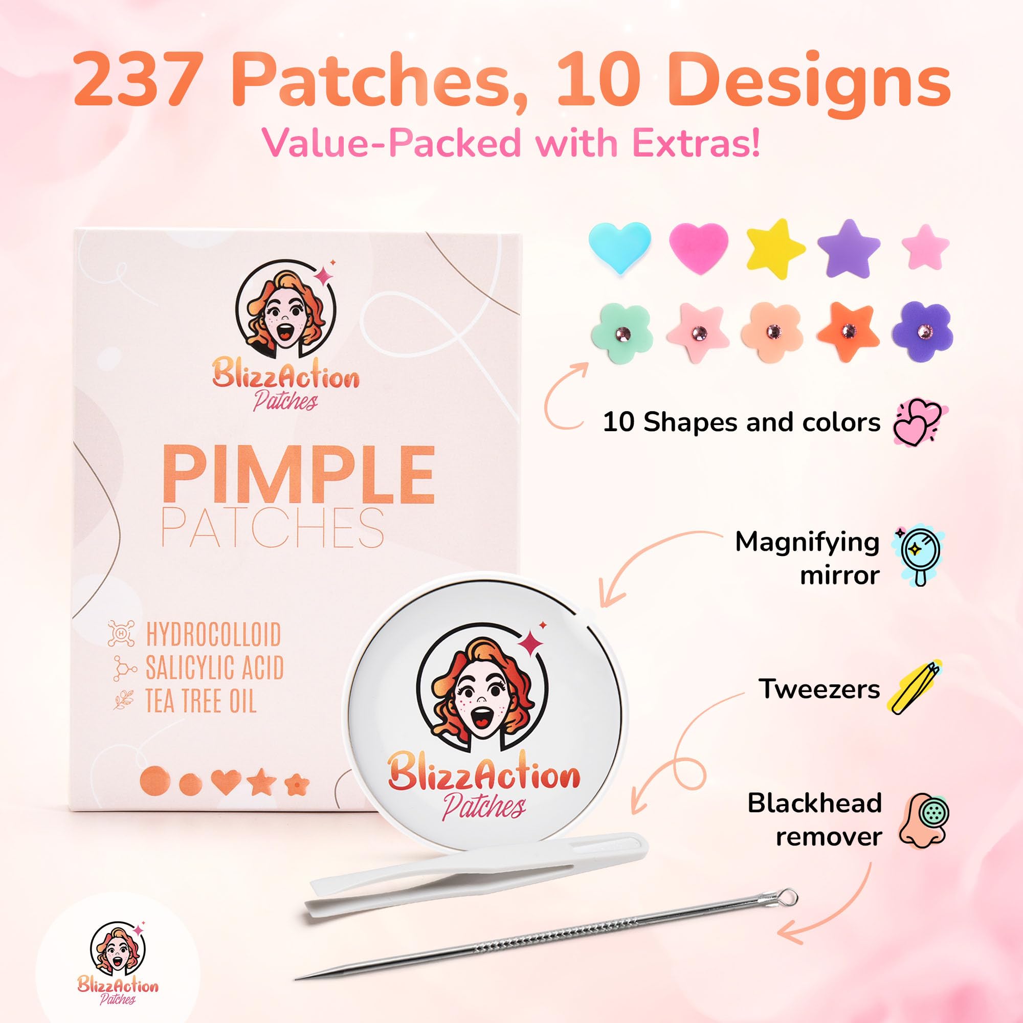 Fun & Colorful Pimple Patches for Teens & Girls Make breakouts more bearable—and way cuter—with our 237-count variety pack of colorful hydrocolloid patches. Featuring stars, hearts, rounds, and rhinestone-studded flower shapes, these fun designs add sparkle to your skincare. Perfect for gifting, slumber parties, or adding joy to your daily self-care routine.