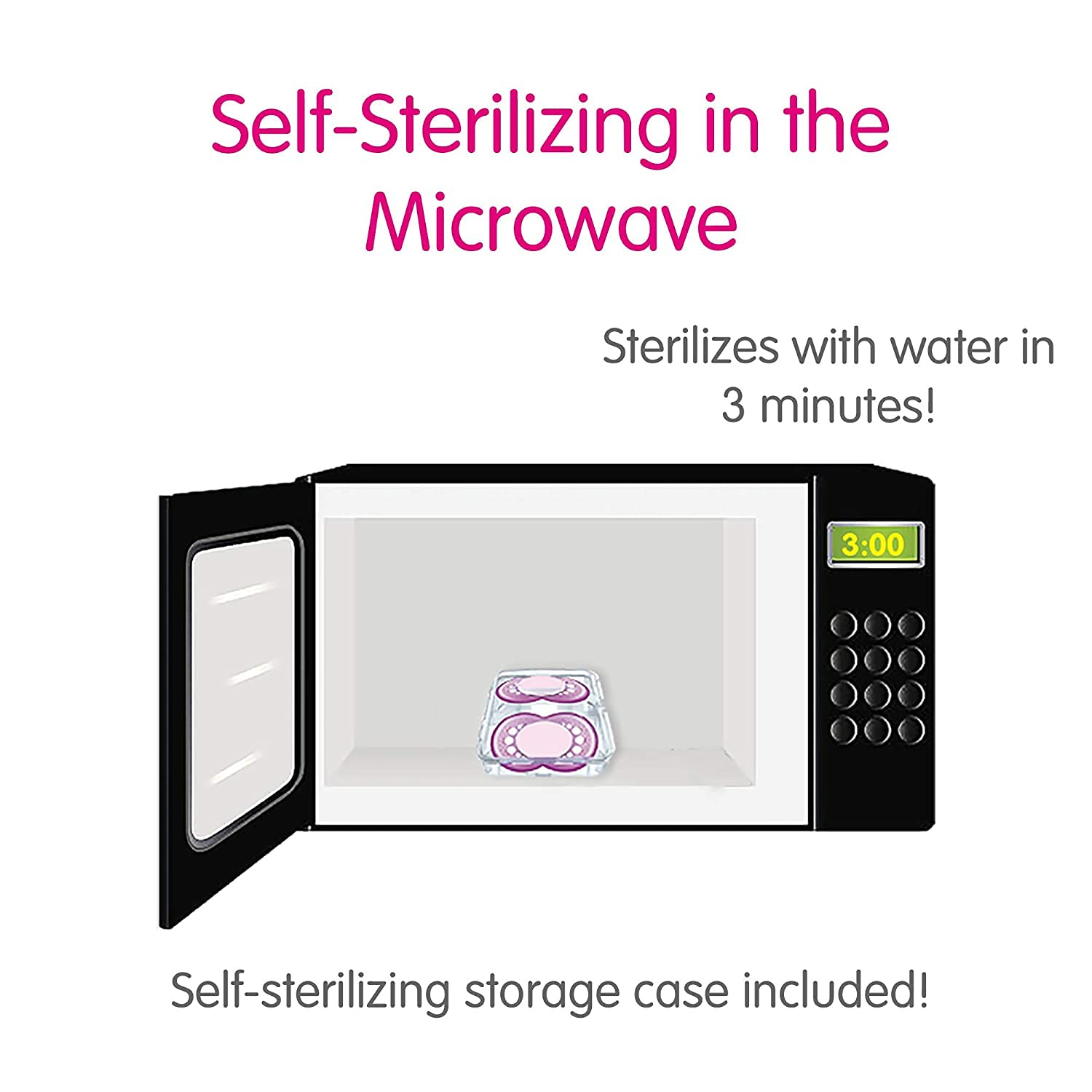 CASE: Add water and pop into the microwave to clean MAM silicone pacifiers 6+ months in just 3 minutes and store in case for at home and travel to protect the pacifiers.