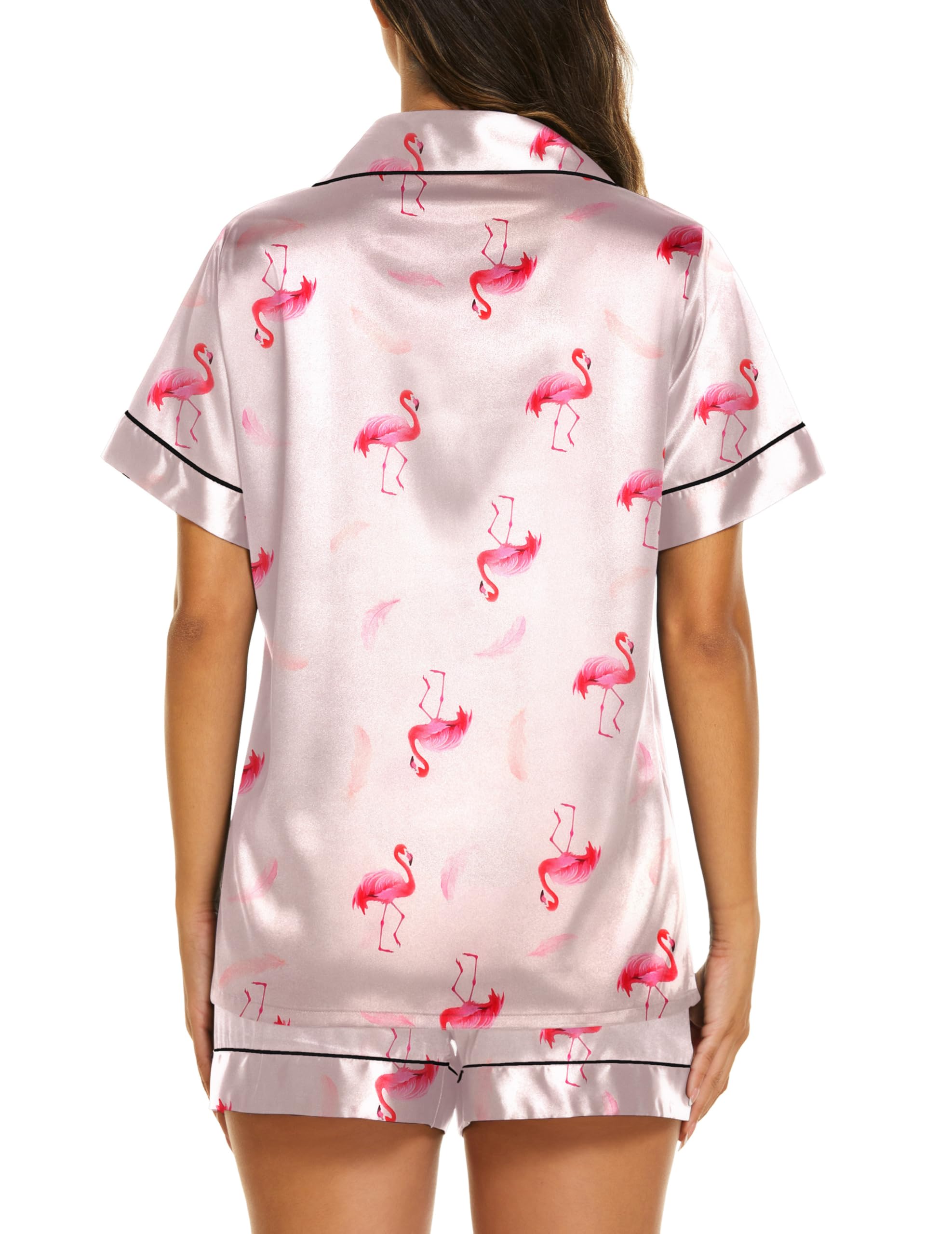Elegant design:Short sleeve pajama tops, button down front,notch lapel collar and one chest pocket.Matching pajama shorts for women with stretchy elastic waist that fits for any body size.Lightweight and Breathable,perfect for sleeping, lounging, or morning coffee in effortless grace