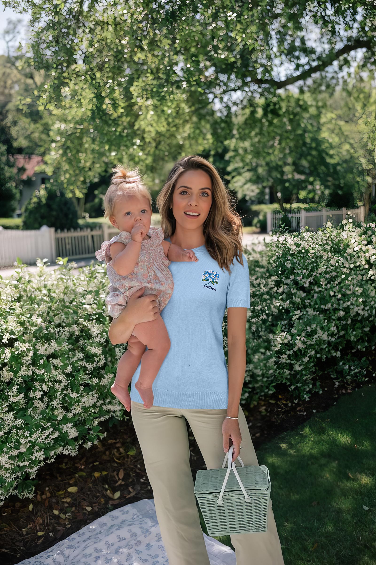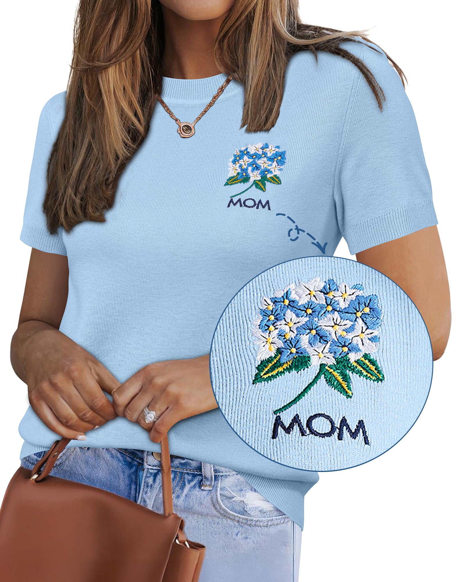 Features: Mothers Day Gifts/ Short Sleeve/ Crew Neck/ Elastic Hem/ Solid Color/ Pullover Sweater/ Cute/ Loose Fit/ Alphabet embroidery