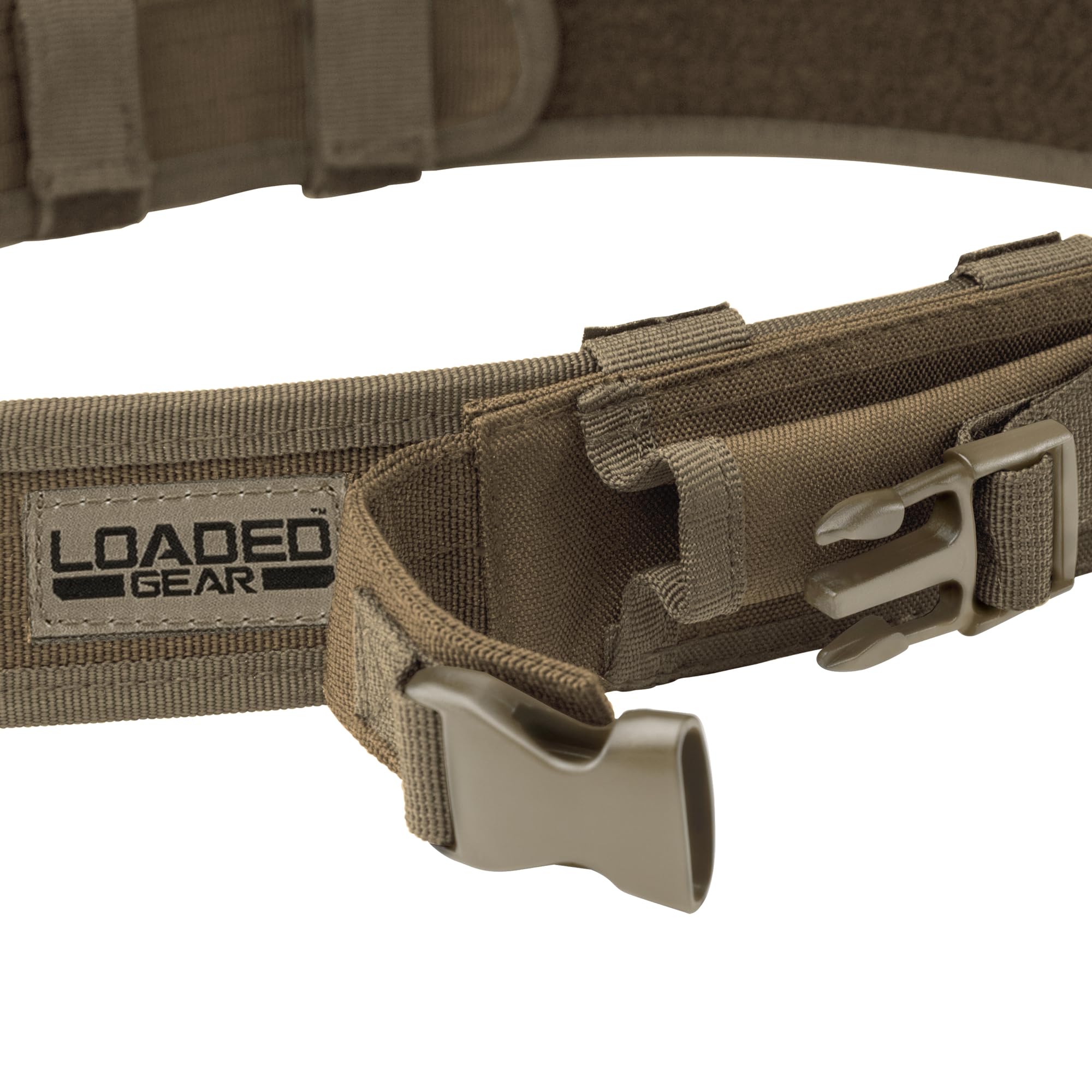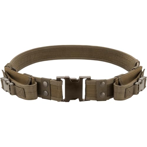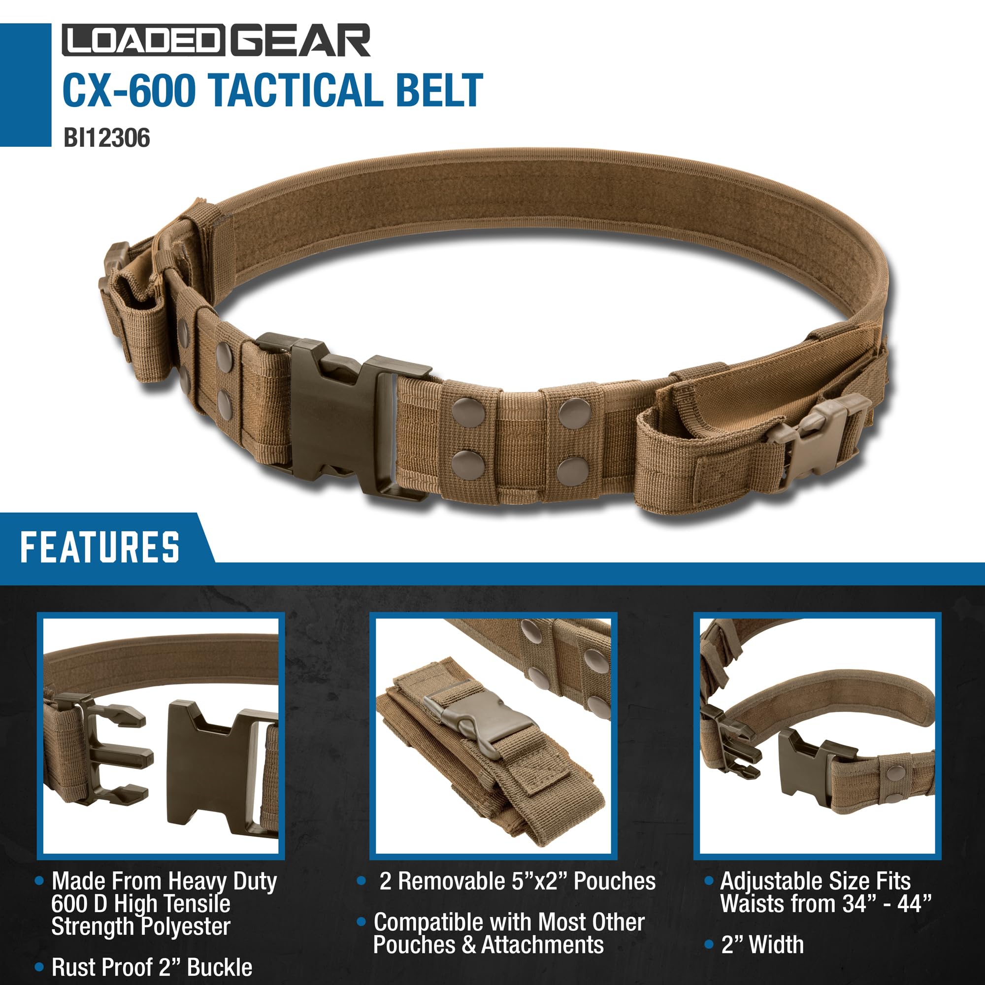 The CX-600 Loaded Gear Tactical Belt from Loaded Gear (Black) is made to keep gear organized and features a quick-release buckle. It is 2" wide, has two removable pouches, and fits waists 34" (86 cm) to 44" (111 cm). The CX-600 Tactical Belt is compatible with such additional accessories as a Dump Pouch or Leg Holster (sold separately).
