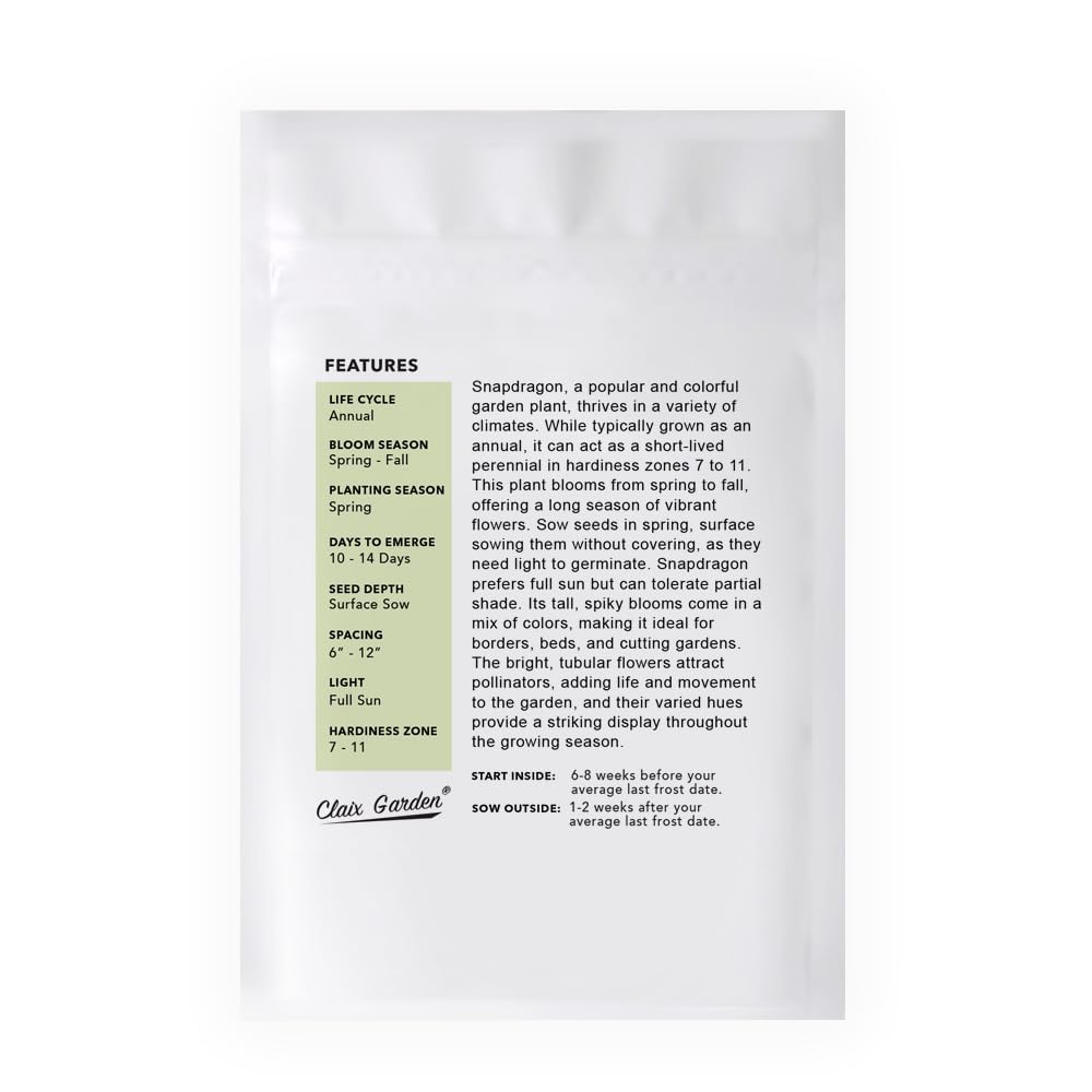 Transform your garden with the vibrant and enchanting beauty of Snapdragon Mix Seeds. This mix offers a stunning array of colors including red, pink, yellow, and white, creating a dynamic and eye-catching display. Snapdragons are perfect for adding striking floral arrangements and borders to your garden, ensuring a visually captivating experience. Snapdragons not only beautify your garden but also support a healthy ecosystem by attracting bees, butterflies, and hummingbirds. Their long blooming season from spring through fall keeps your garden colorful and lively for months. Known for their unique, dragon-shaped flowers, snapdragons add a whimsical touch that delights both children and adults. Easy to grow and adaptable to various soil types, snapdragons are a low-maintenance choice that brings continuous beauty and charm to any garden. Start growing your Snapdragon Mix today and enjoy the delightful and magical presence these flowers bring to your outdoor space.
