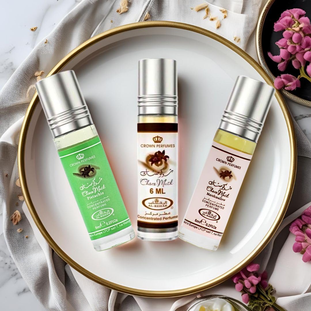 Al-Rehab Perfumes: A Blend of Tradition and Modern Craftsmanship Discover Al-Rehab Perfumes, a renowned fragrance brand offering high-quality, long-lasting scents. Al-Rehab has combined Middle Eastern perfume-making traditions with contemporary fragrances. Specializing in oil-based attars and alcohol-free options, Al-Rehab delivers a luxurious and authentic fragrance experience. Choco Musk, Choco Musk Marshmallow & Choco Musk Pistachio Perfume Oils 6ml This bundle includes three deliciously indulgent Choco Musk fragrances by Al Rehab, each offering its own unique gourmand charm. Choco Musk is warm and velvety, blending spicy amber, sweet vanilla, and rich cocoa for a classic chocolatey finish. Choco Musk Marshmallow is sweet and cozy, with notes of strawberry, marshmallow, and creamy cacao for a playful twist. Choco Musk Pistachio is creamy and nutty, combining pistachio, musk, and cacao over a smooth vanilla-amber base. Premium Ingredients & Innovative Scents Crafted using the finest ingredients like exotic woods, floral notes, and aromatic spices, Al-Rehab creates unique fragrances that honor traditional Arabic perfumery while introducing modern innovation. Elegant Packaging Each fragrance is housed in minimalist packaging that reflects the brand’s commitment to quality and excellence. Discover the perfect blend of tradition and modernity with Al-Rehab Perfumes, offering an unforgettable fragrance experience.