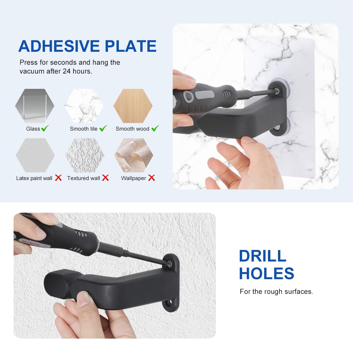 Two-method Installation: 1. Drill holes on drywall; 2. Use the adhesive plate on smooth tiles, wood or glass surfaces. (Note:1. The adhesive plate is unsuitable for drywall, wallpaper, brick, or non-stick surfaces. 2. Please leave the adhesive plate for at least 24 hours and then hang the vacuum. 3. Keep it horizontally or tilt it slightly upward before installing.)