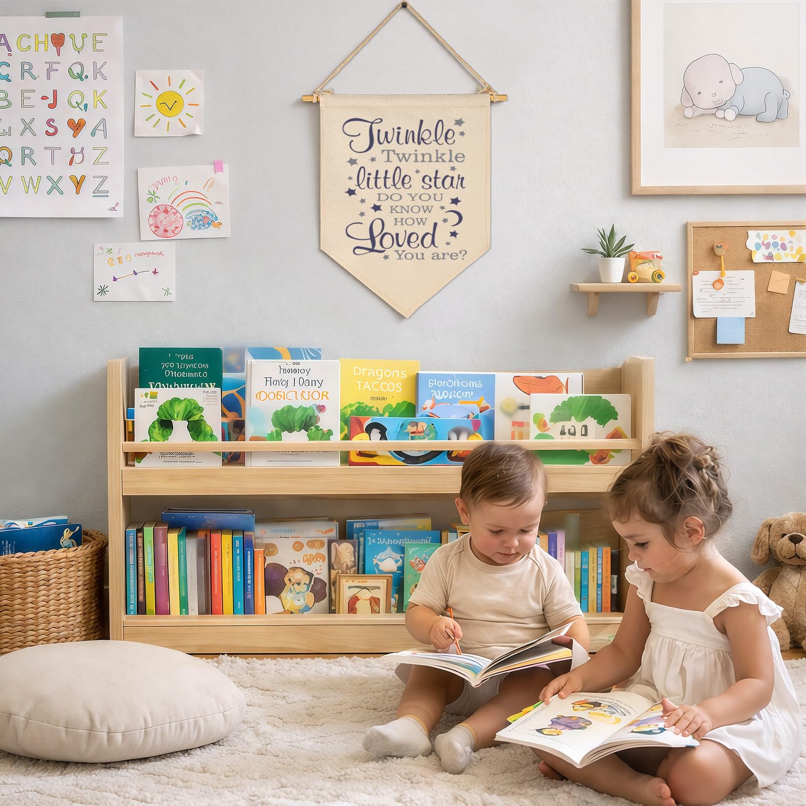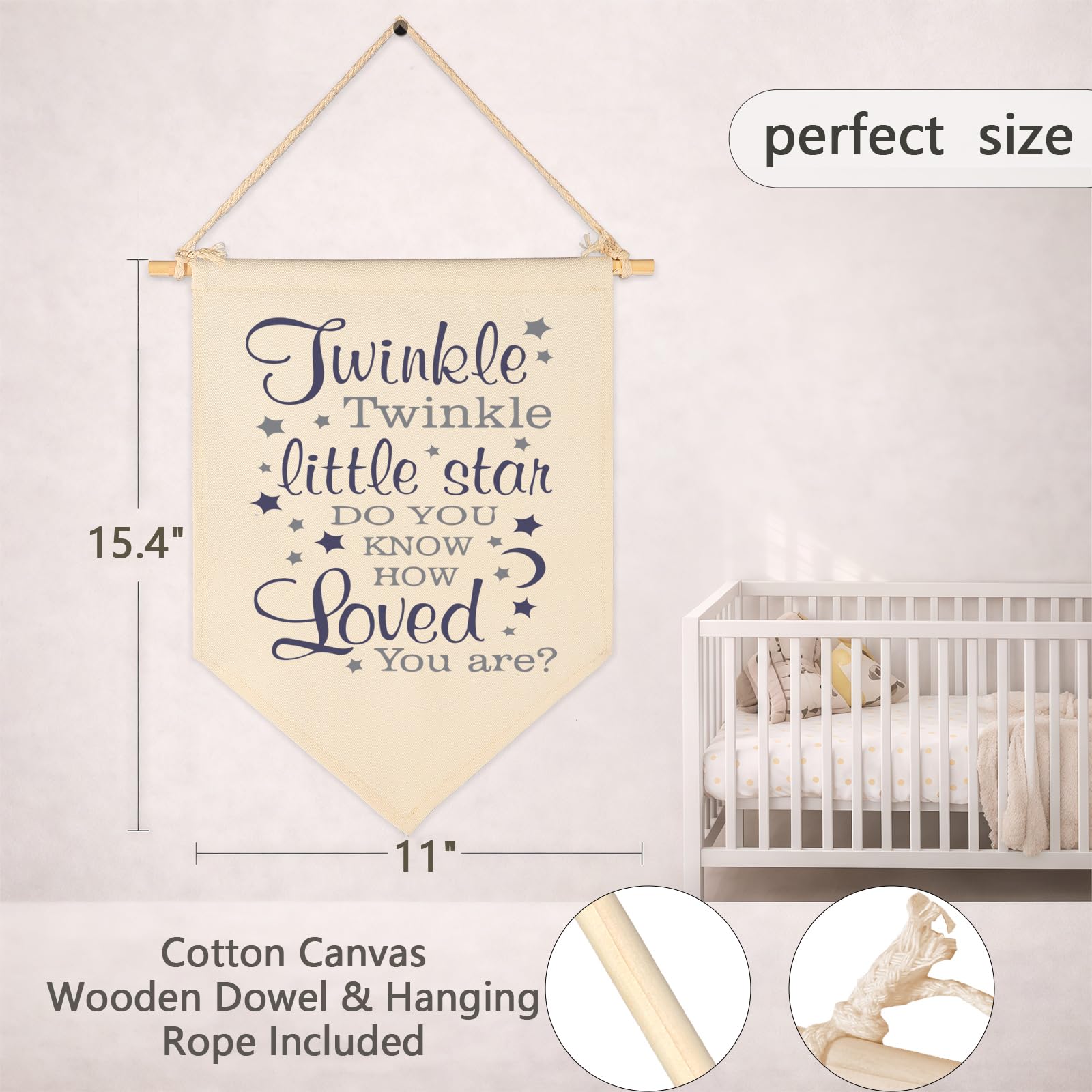 Durable natural cotton canvas banner adds lively color and cozy texture to nursery baby room wall decor, fade-resistant to stay bright year after year. Size 15.4" x 11" fits small or big spaces, perfect on a nursery wall, bookshelf, in a kids room, playroom, teen room, or reading nook. Ready to hang with pre-tied twine and 1 wooden stick, lightweight and easy to remove. A heartfelt gift for baby shower, birthday, Christmas, New Year.