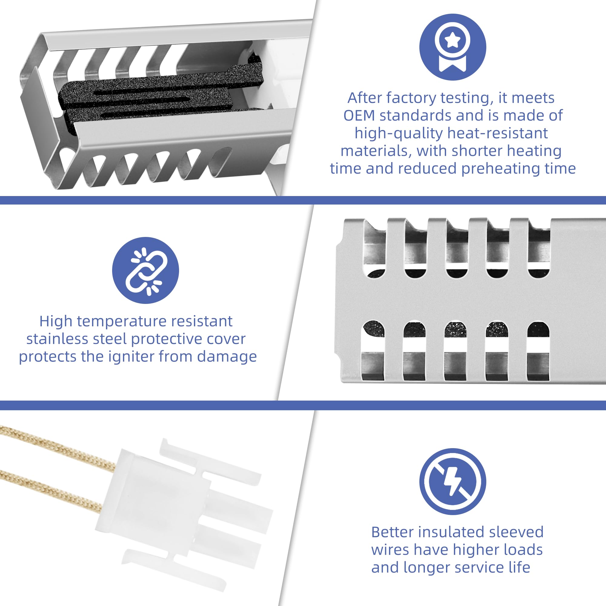 【PRODUCT INCLUDED】: oven igniter includes 2 ceramic wire nuts,1 connector plug,and two connecting wires.Perfectly solve the problem of oven not heating or heating slowly,extending the service life of the oven.