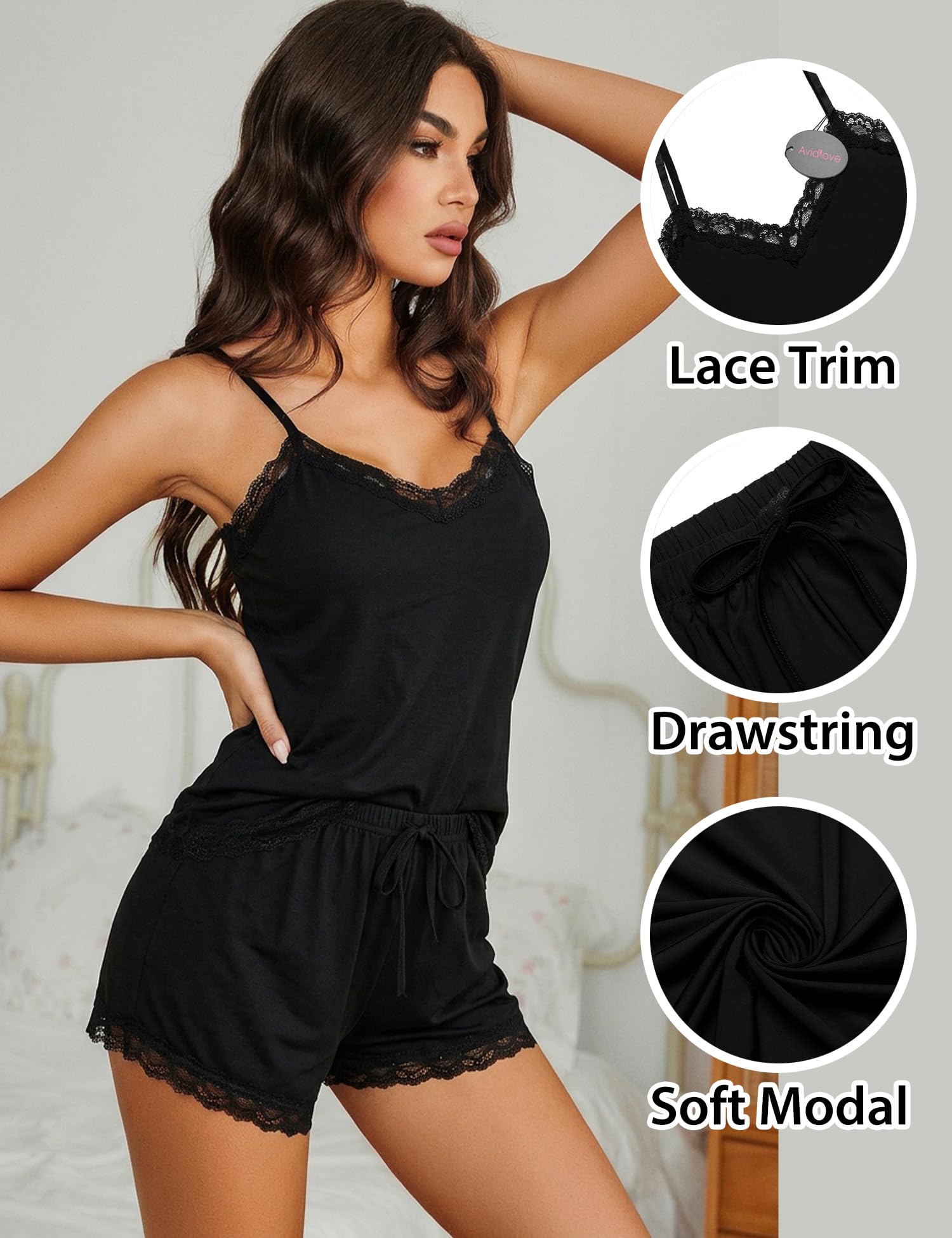 Cami pajama set women shorts featuring a plunging v neck, decent lace trim and adjustable shoulder straps, simple and stylish, shows off your body curves in nice coverage way