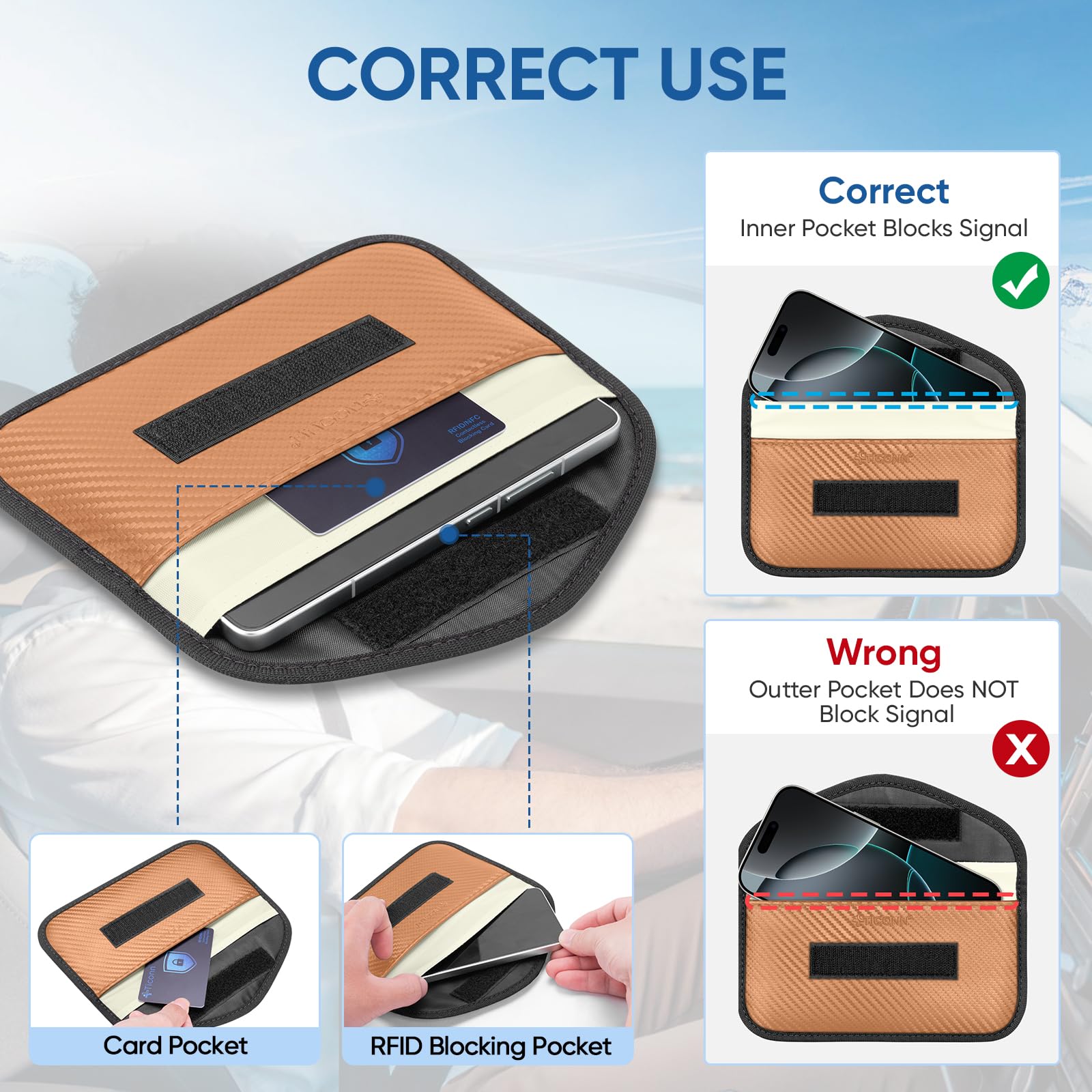 Convenience: The smaller/front pocket is anti-radiation, best for storing ID card, bank cards, etc; The larger/back pocket is for signal blocking, best for storing car key fobs