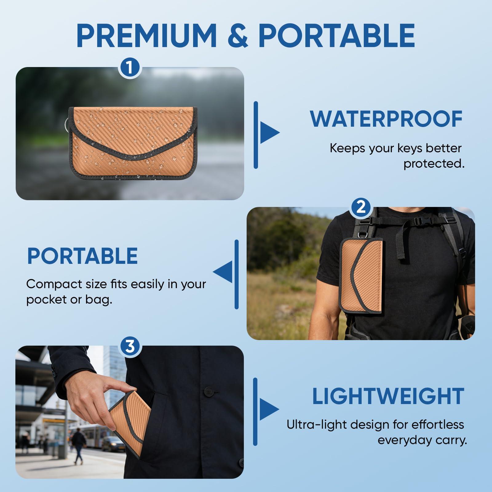 Premium Quality: TICONN Faraday bag features premium carbon fiber-textured material with dual-layer shielding that blocks WiFi, Bluetooth, GPS, RFID, NFC, and car key fob signals while providing water resistance; It is packaged in a gift box, making it a stylish and luxurious gift