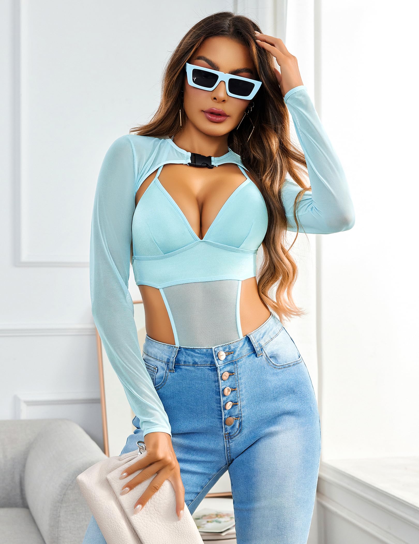 This rave outfits set includes a backless bodysuit and a shrug shoulder top that can be mixed and matched to create different looks that suit your style. The mesh crop top is designed with a plastic buckle closure, making it easy to put on and take off. Wear it with a lace bralette, tank, camisole, or bra for a club-ready outfit or a more casual look. Thumb holes keep your sleeves in place