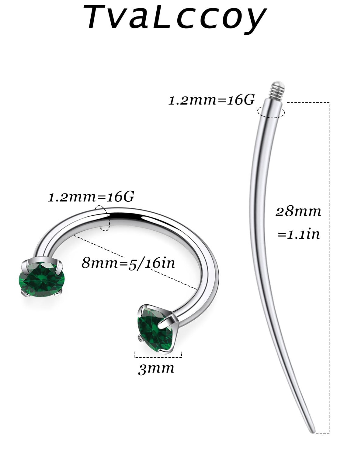 Dimension: All piercing jewelry is 16G=1.2mm, Inner diameter is 5/16in=8mm, Ends Diameter: 3mm.