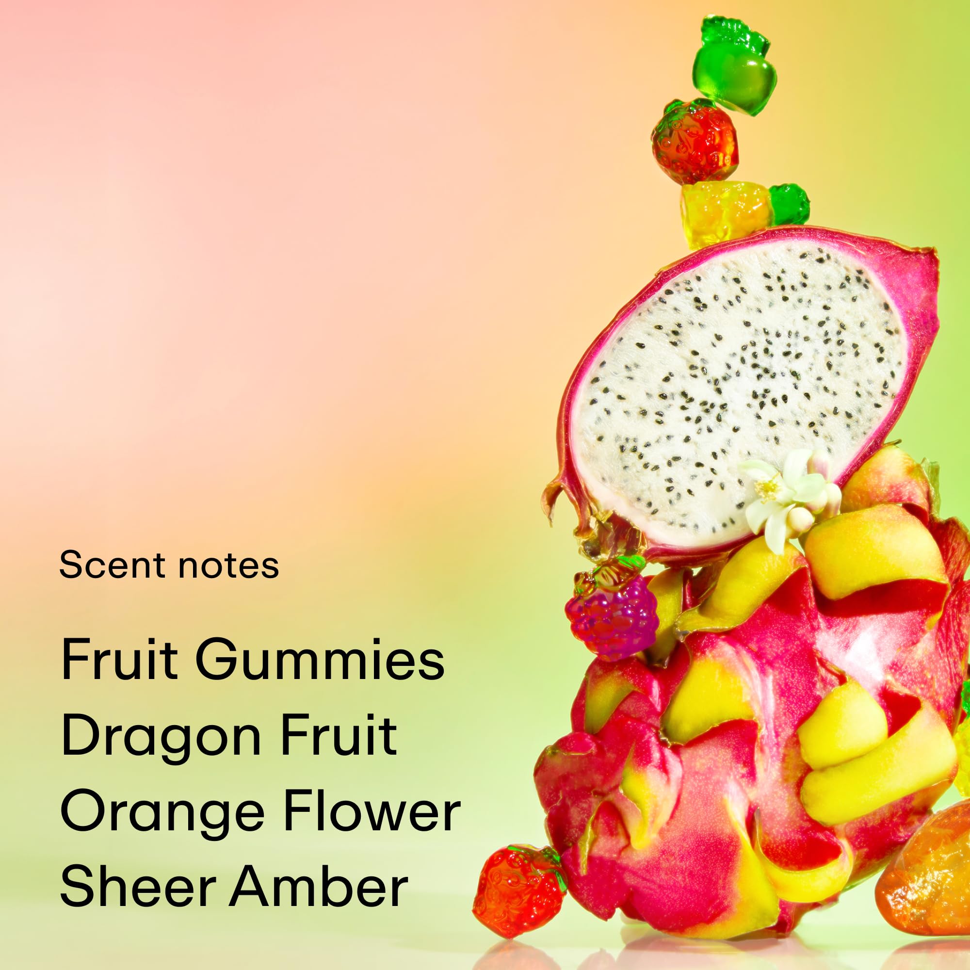 SCENT NOTES: TOP: Pitaya Pulp, Sweet Orange, Fruit Gummies. HEART: Orange Flower, Jasmine Sambac, Marigold Bloom. BASE: Patchouli Prisma, Glazed Musks, Sheer Amber