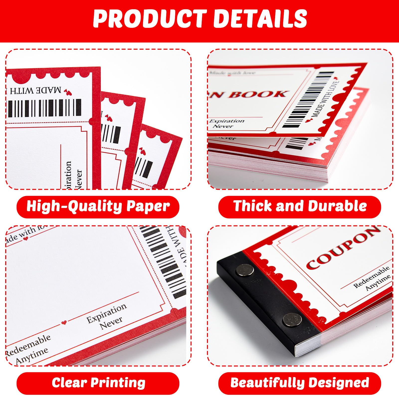 Material of the Coupons: the coupon book is made of high-quality materials, thick and durable, ensuring it remains intact and visually appealing even with frequent use.