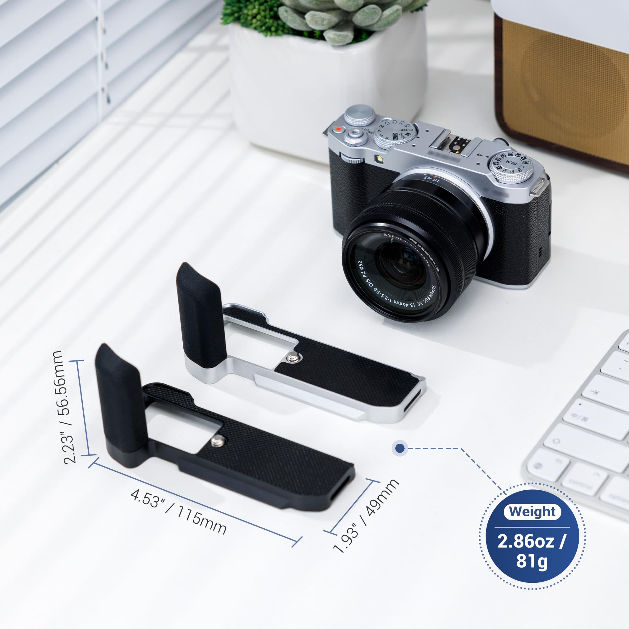 Made of aluminium alloy, it is sturdy and durable. The microfibre leather on the surface of the grip is non-slip and comfortable. There is also a silicone pad at the bottom of the handle, which can not only prevent scratches on the camera, it also increase friction to reduce the risk of camera dropping, providing a stable and secure XM5 handgrip.