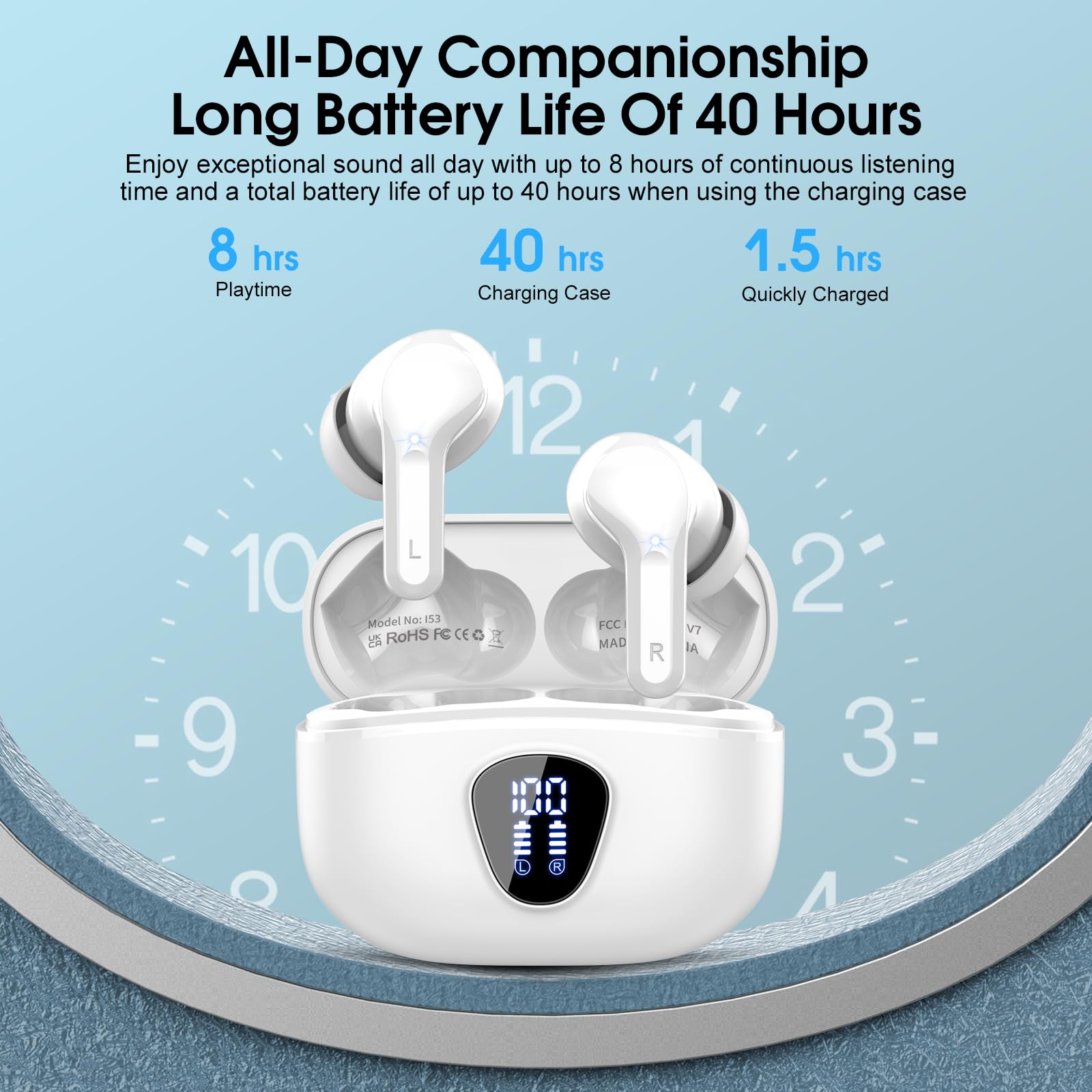 48H long-lasting battery life & dual LED digital display: Up to 8 hours of music playback on a single charge (1.5h only) with the charging box, this in ear headphones offers up to 48H of battery life, ensuring you can use it for a long time without frequent charging.The LED display clearly shows the battery level of the earbuds wireless bluetooth and the charging box, ensuring you always know the remaining power and enjoy an uninterrupted music experience during a long journey or a busy workday.