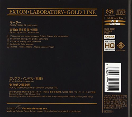 (SACD-HYBRID) Eliahu Inbal conducts the Tokyo Metropolitan Symphony Orchestra for this one point microphone recording of Mahler's Fifth Symphony. This Exton Laboratory Gold Line Hybrid Stereo disc is a high quality non-compressed Japanese Import SACD. Recorded on a custom Sony DSD recorder, this audiophile SACD is packaged in an XRCD-like luxury digipak. This disc includes a booklet with detailed microphone and equipment diagram and placement used for each individual recording! Superior quality Japanese Import SACD, manufactured in Yokohama, Japan. Only the best recordings - technically and artistically! This Hybrid SACD contains a 'Red Book' Stereo CD Layer which is playable on most conventional CD Players!