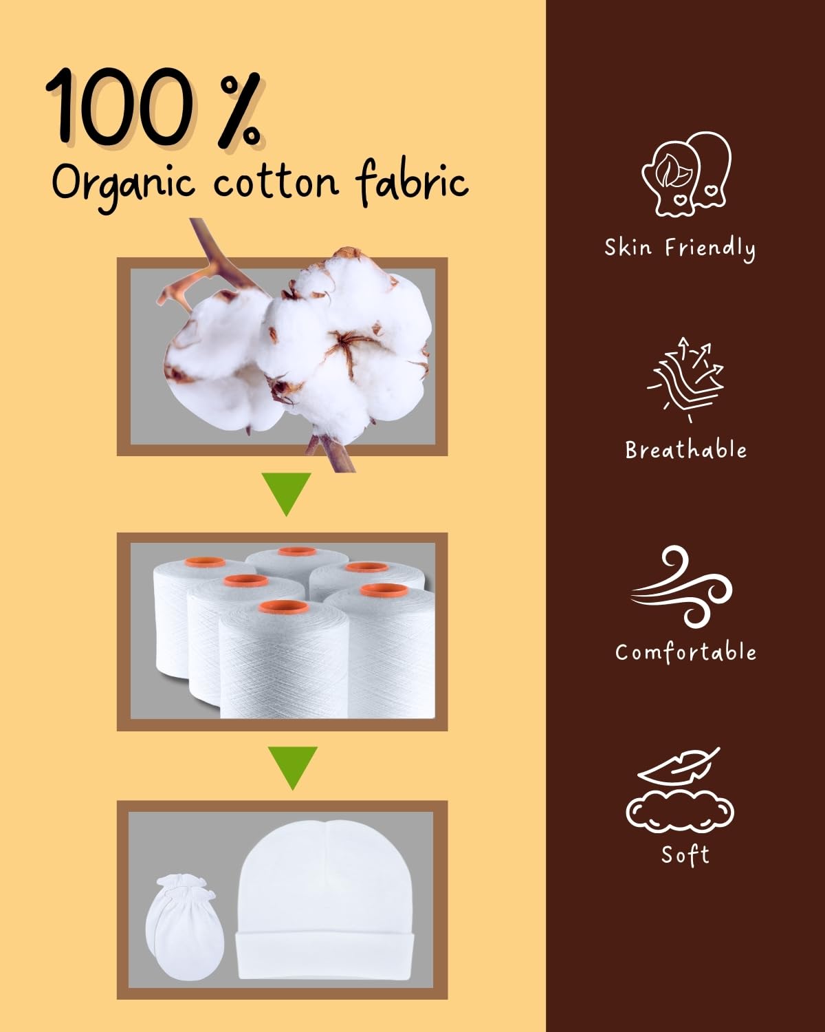 MADE OF COTTON : This baby hats is made of organic cotton which is not irritating, ultra-soft, and stretchy for comfort. Baby beanie & mittens are soft and light, more comfortable for your babyβs delicate skin. Stretchy enough to comfortably fit your baby 0-6 months.