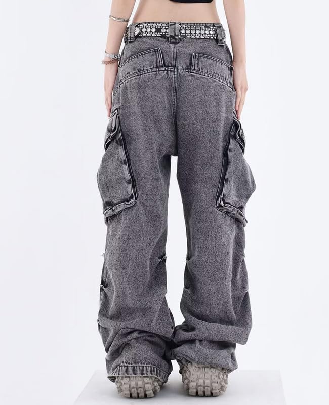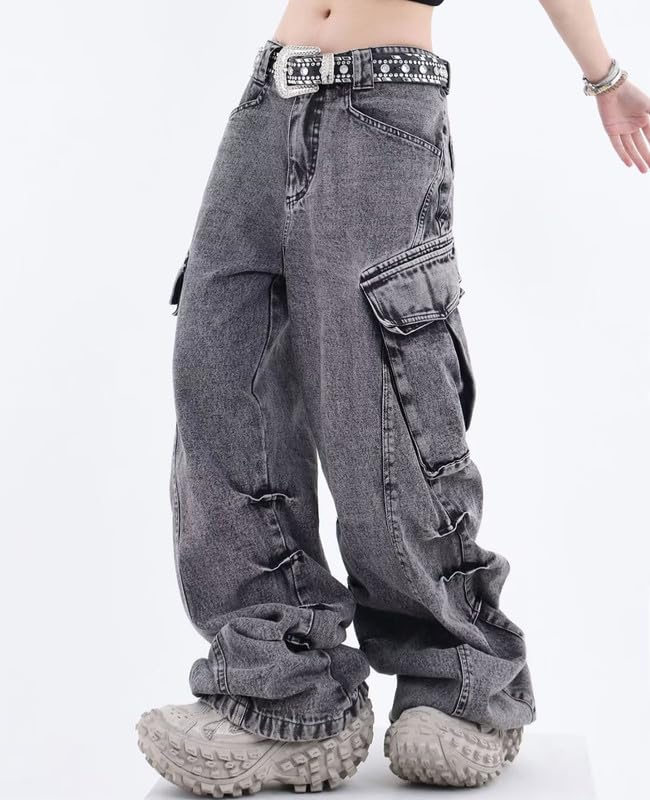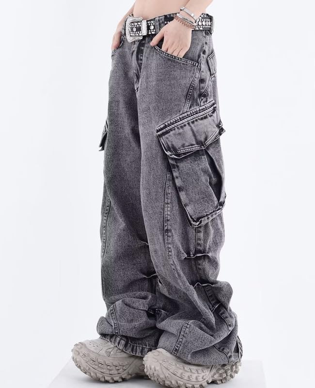 Features:Wide leg cargo jeans with big pockets, stretch elastic mid waist,zipper and button closure,hip hop, y2k style, grunge jeans, and the loose fit is ideal for casual or sporty