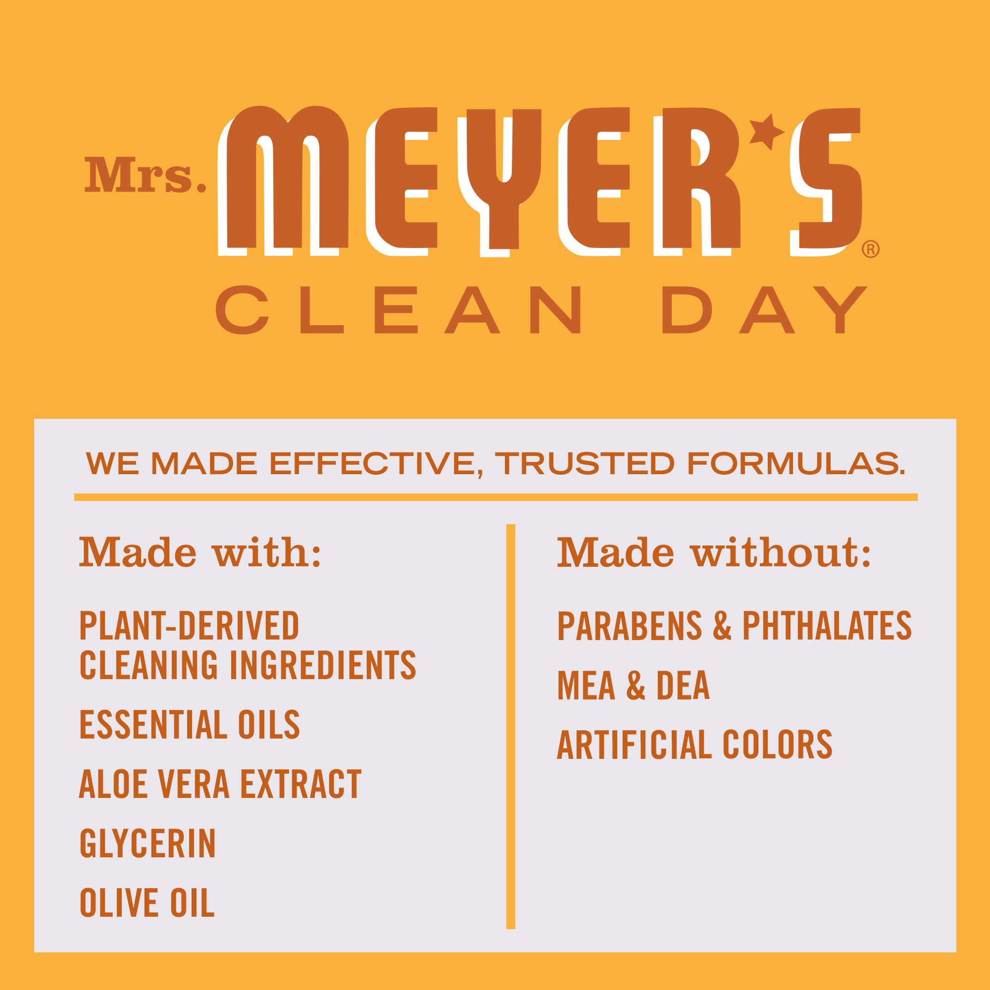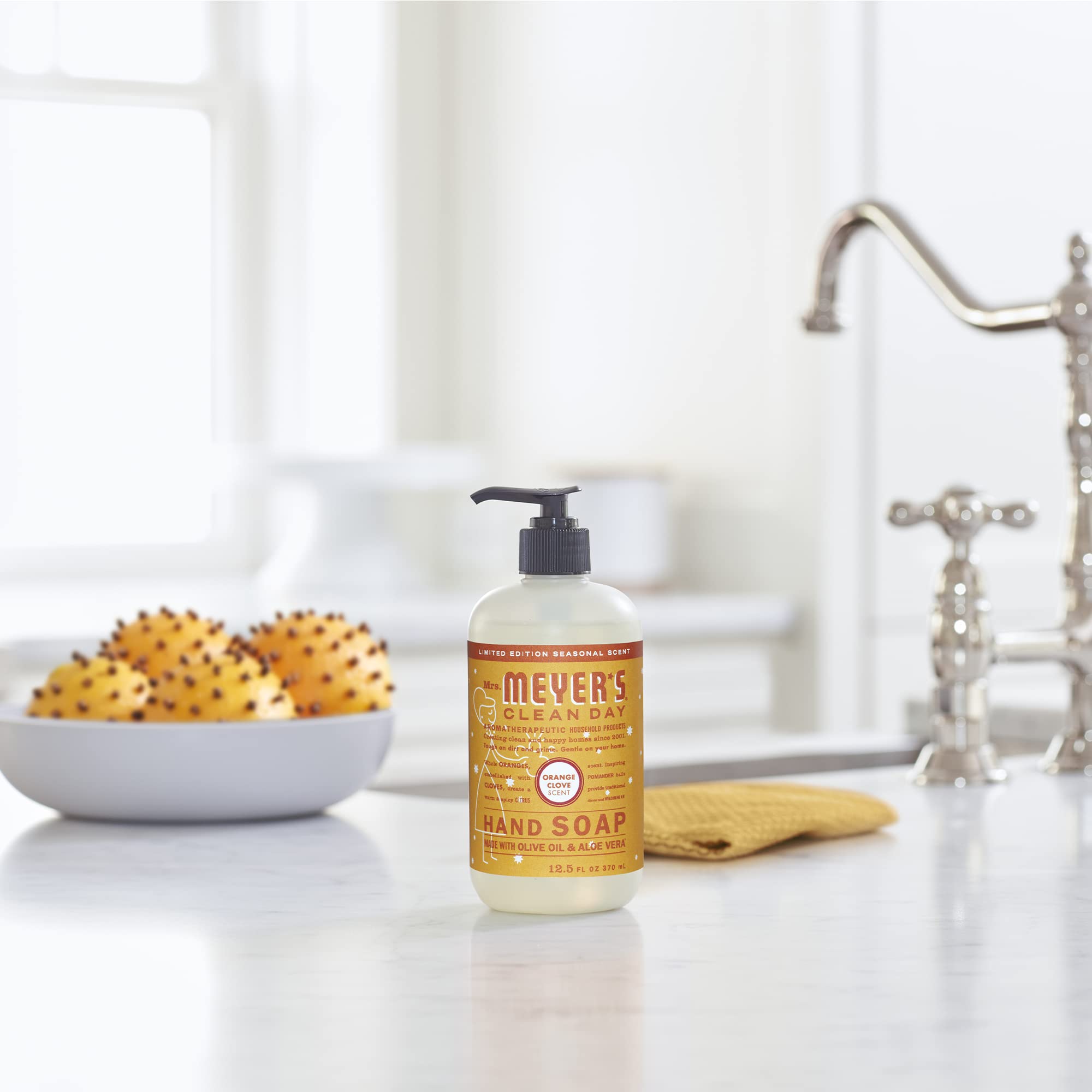 Mrs. Meyer’s Clean Day hand soaps are specifically made to clean and freshen hands without over drying, while also providing a special, singular scent for your home. Orange Clove scented hand soap brings together warm, spicy, and citrus notes for a truly unique holiday combination. This hardworking hand soap formula contains olive oil, aloe vera, and essential oils, and thoughtfully chosen ingredients that clean and freshen hands. Made without parabens, phthalates or animal-derived ingredients and always a cruelty-free formula soap. Also available in other garden-inspired scents and products such as Dish Soap and Multi-Surface Cleaner. Mrs. Meyer’s – Rooted in Goodness.