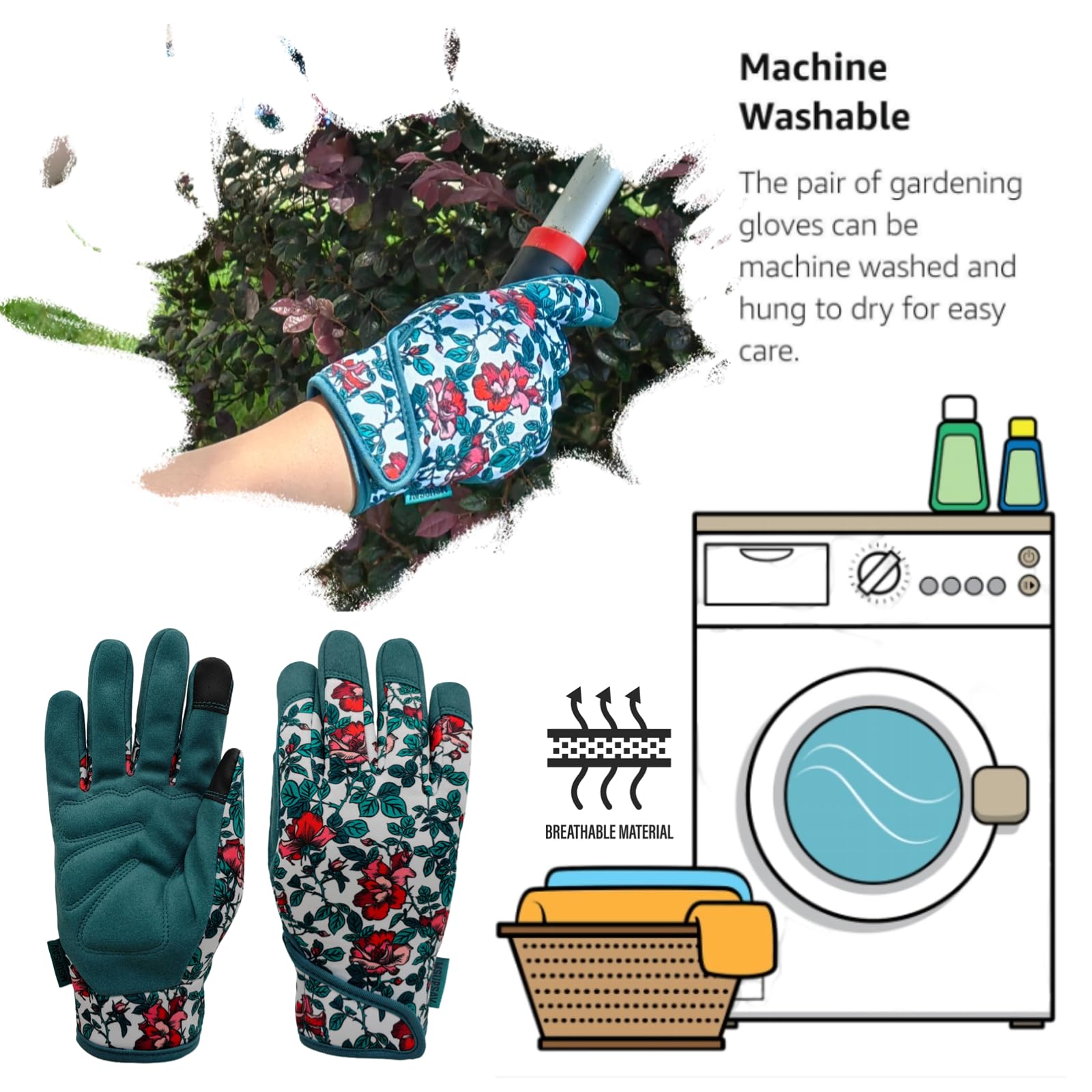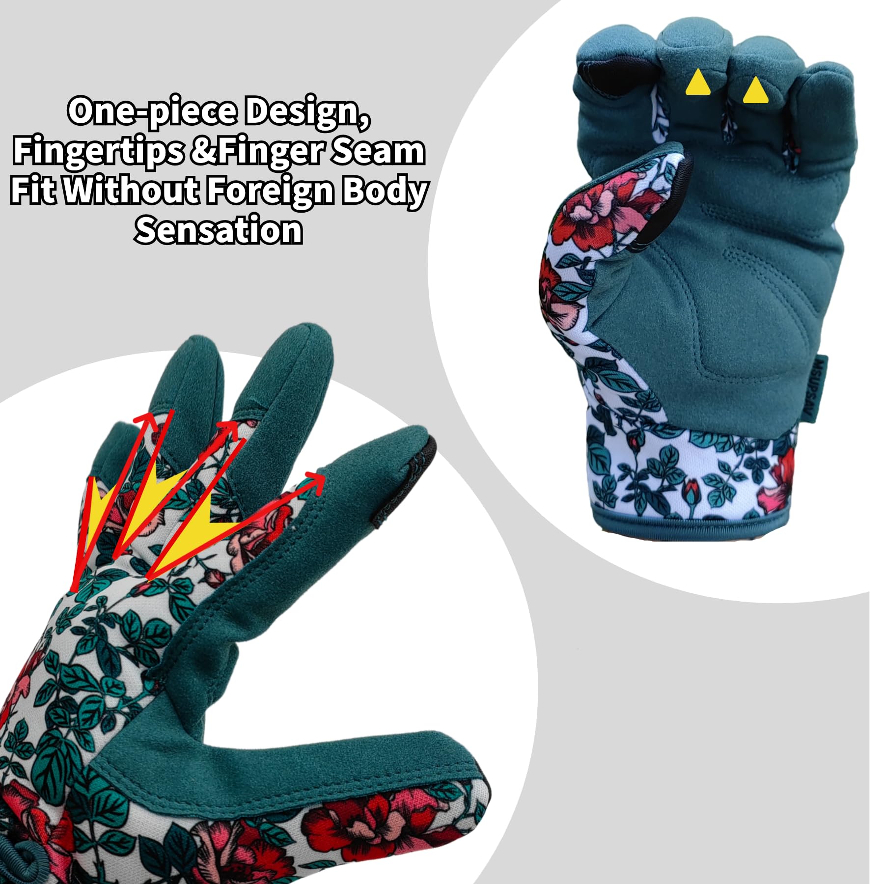 ❸ Gardening Gloves with Touchscreen Compatible & Ergonomic Fit-The unique and practical 2 touchscreen capability design(thumb&forefinger) that assures you won't have to remove the glove in order to use your phone.Work gloves ensure snug fit with amazing flexibility&comfort.Sizing is based on women’s sizes from the size guide .Choose your size according to the size chart.