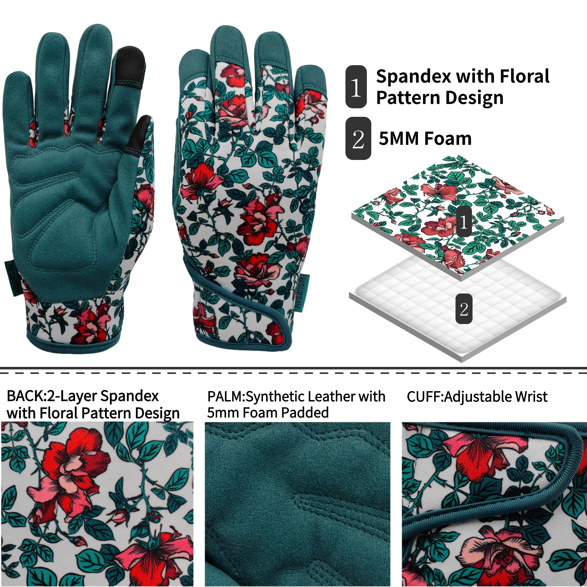 ❷ Garden Gloves for Gardening-Stretchable double-layer spandex design back keep your hands flexible,breathable&comfortable on the job.Synthetic leather with foam padded palm provides excellent abrasion, puncture and tear resistance and reinforced fingertips for added durability.One piece design without foreign body sensation in the finger seam.Supportive adjustable with hook&loop strips closure cuff for snug secure fit.