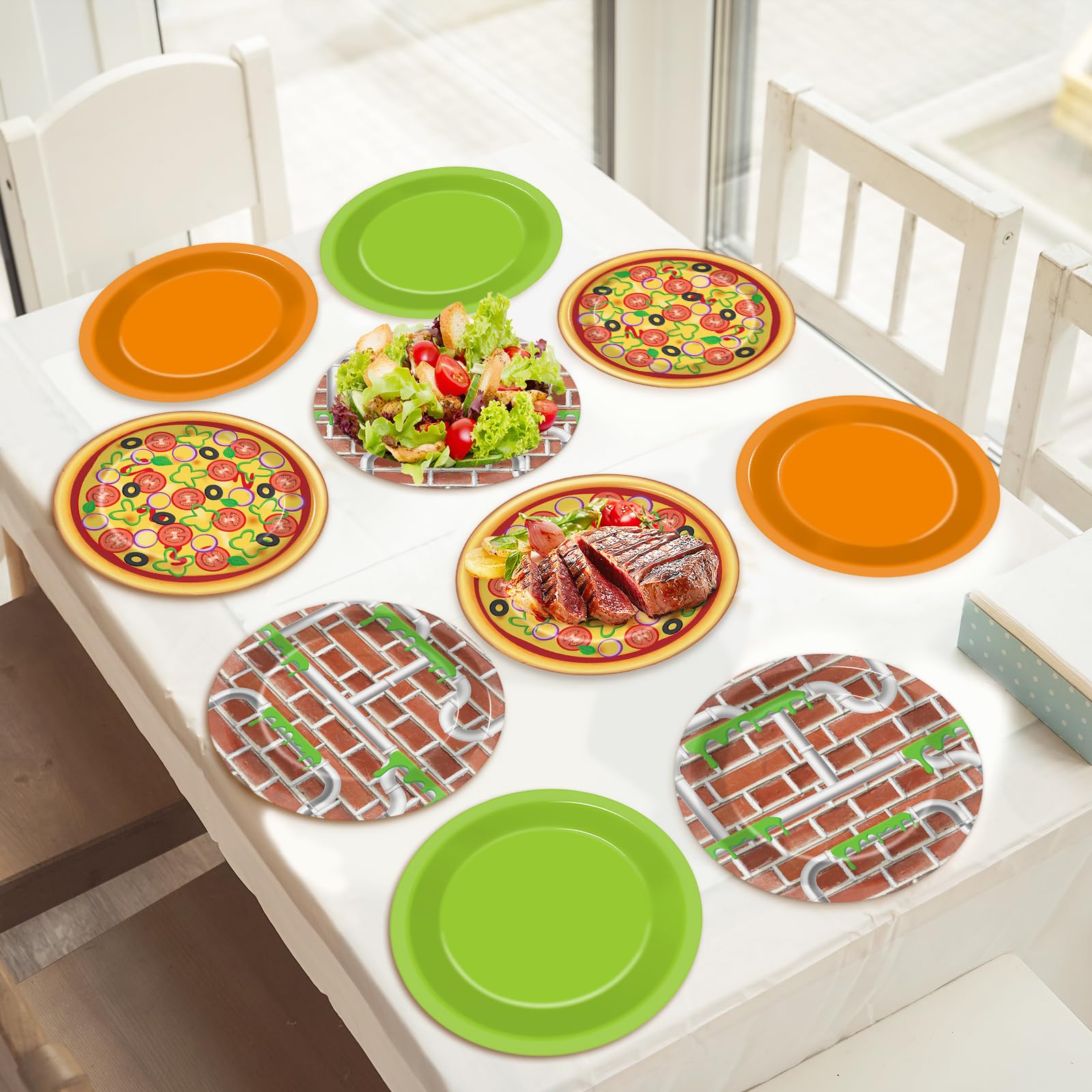 Turtle and Pizza Design:: Our party paper plates come in 3 style:Solid Green and Orange, Pizza and Green Turtle with Red Brick Wall. Unique style design adds a lot of mystery to your party,rich styles enough to meet your needs.