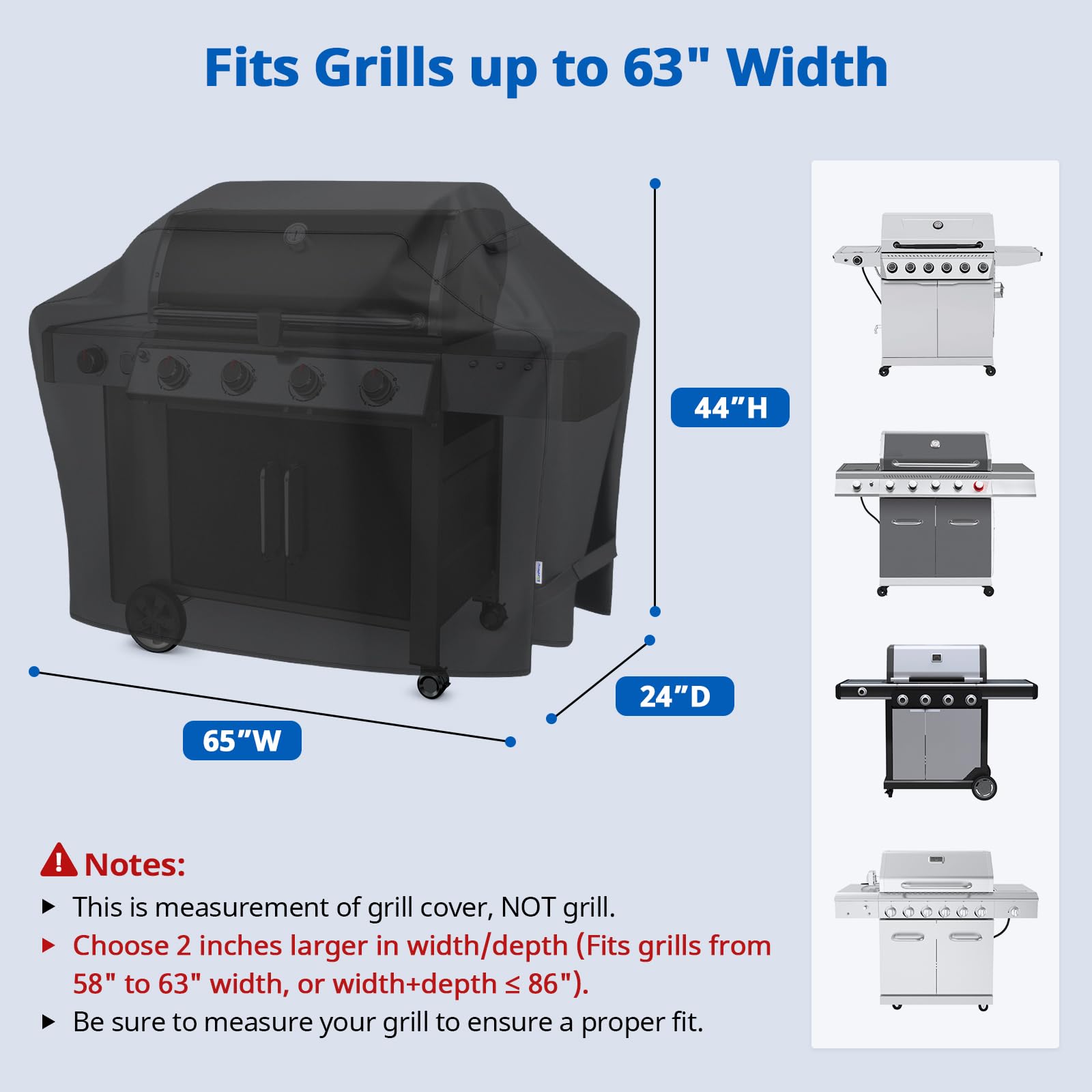 BBQ Cover Dimension - 65"W x 24"D x 44"H, compatible for most large 4-burner, 5-burner and 6-burner BBQ gas grills in width from 58" to 63", like Weber Charbroil Kenmore Nexgrill Jenn-Air Napoleon Brinkmann and so on. Be sure to measure your grill size before purchasing and choose a cover with space to spare.