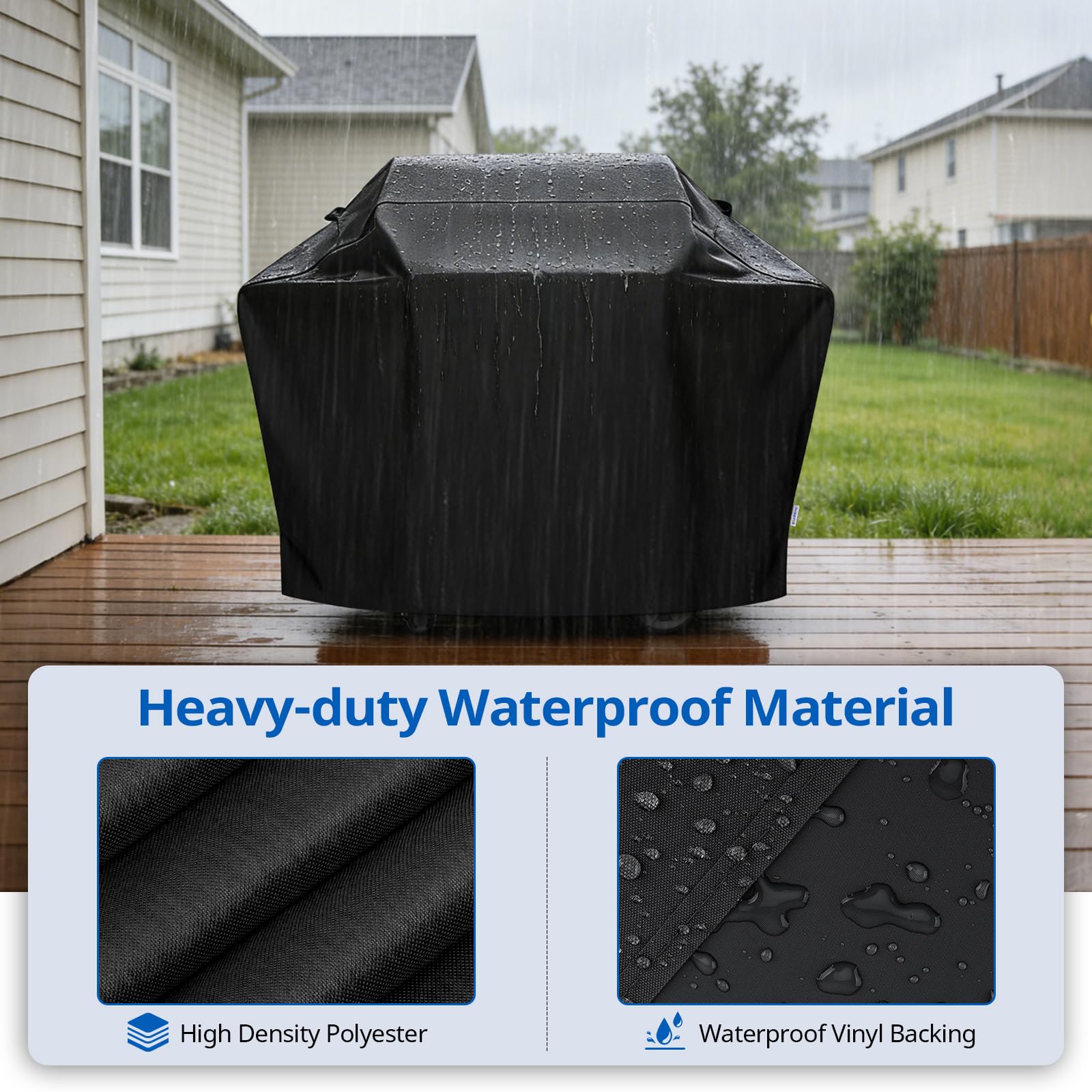 FadeStop and Waterproof - Made of high performance UV resistant and FadeStop Polyester fabric with waterproof vinyl lining, resists to fading, tearing and cold cracking, so your grill will be protected from sun damage, rain, snow, dust and debris all year round.