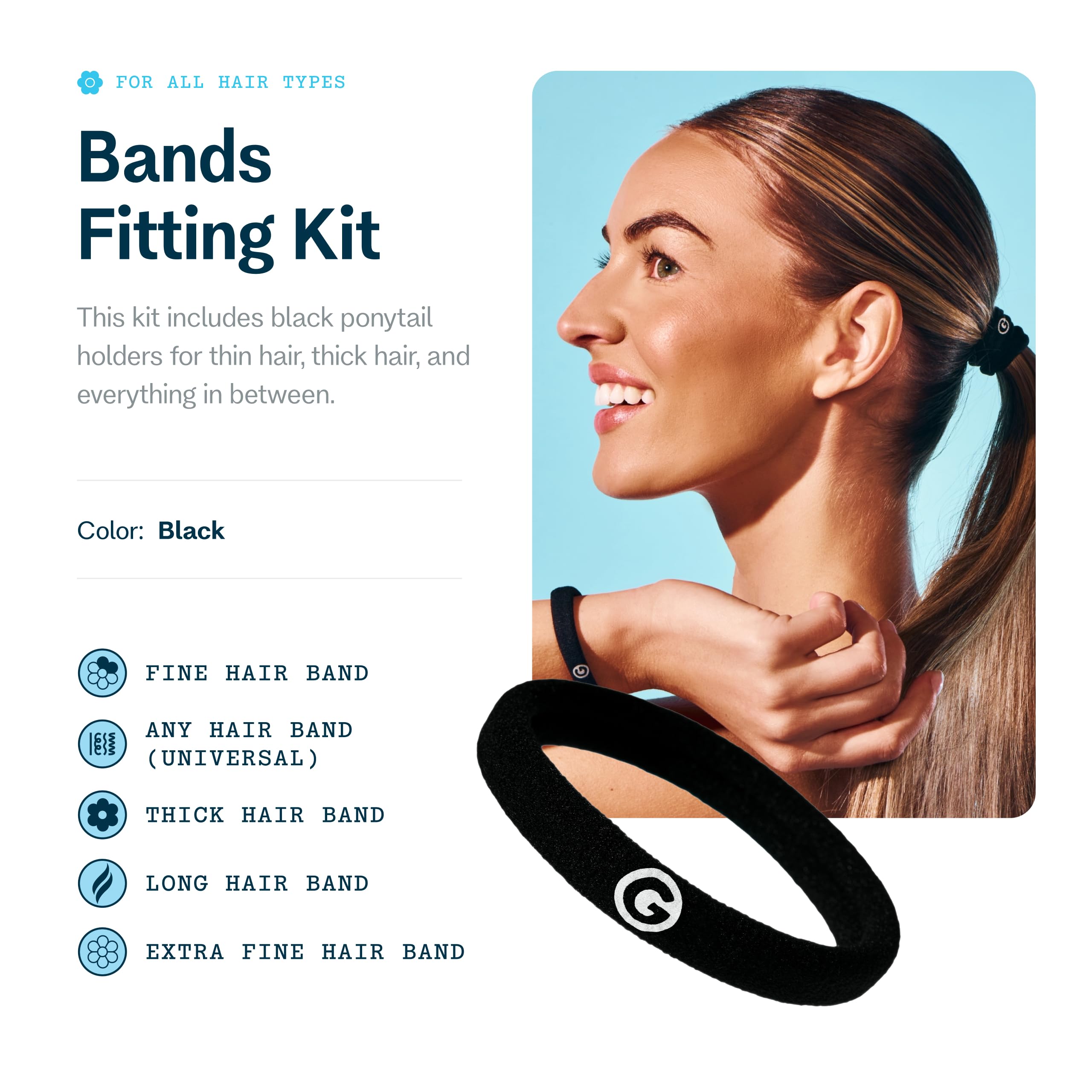 Hair Ties for All: Whether you have fine or curly hair, find the perfect fit with our Bands Fitting Kit; 5 count black hair ties