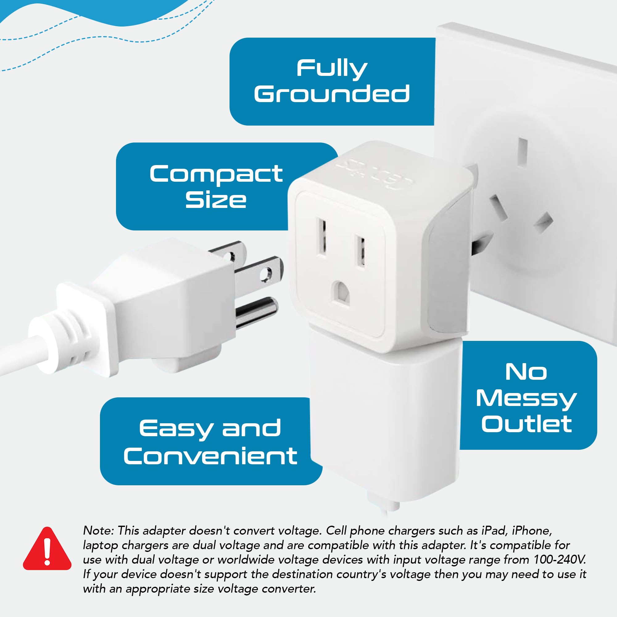ULTRA-COMPACT: Ceptics US to Australia, China plug adapter only measures 1.5 x 1.5 x 1.75" & Max Load Rating: 10A/250V, Fully Grounded also ensures safety!