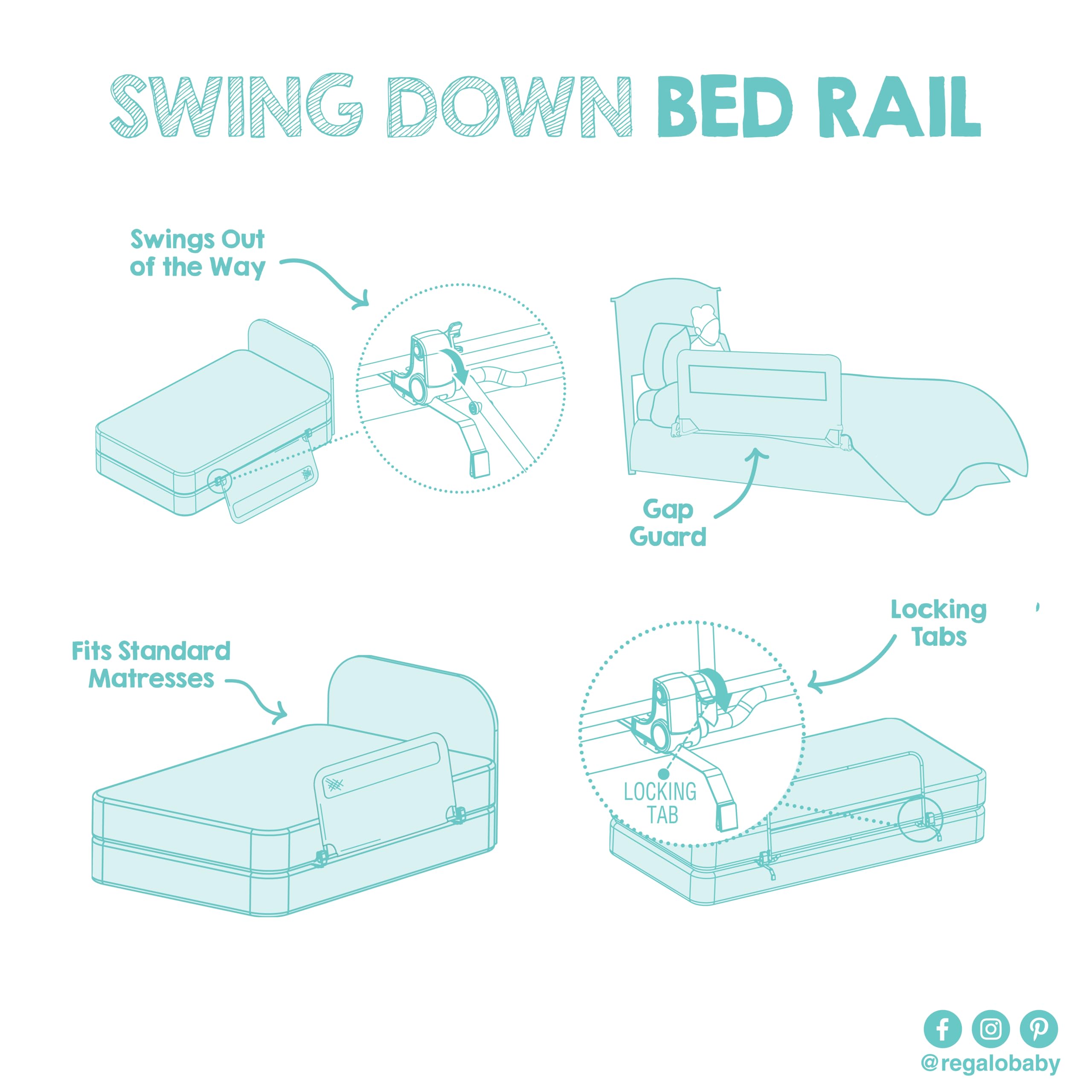 Help your child sleep more safely with the Regalo 54-Inch Extra Long Bed Rail Guard, designed to provide extra protection for toddlers transitioning from a crib to a big kid bed. The extended 54-inch length and 20-inch tall sidewall create a strong barrier that helps prevent nighttime falls while still allowing comfortable sleep. The patented swing-down feature allows the rail to pivot down and out of the way when not in use, making it easier for parents and children to get in and out of bed or change sheets. This convenient design makes the rail practical for everyday family use. For additional security, the bed rail includes Regalo’s exclusive Gap Guard system, designed to help prevent gaps between the mattress and the rail. The reinforced anchor safety system attaches the rail securely to the bed to help keep it stable throughout the night. Built with a durable all-metal frame, this toddler bed rail guard is designed for long-lasting reliability. Installation is quick and simple with a no-tools-required setup, allowing parents to assemble and install the rail in minutes. Designed for use with a mattress and box spring, the rail fits twin, full, and queen size beds. Recommended for children ages 2–5 years old, this extra-long bed rail helps provide parents with added peace of mind while their child sleeps.