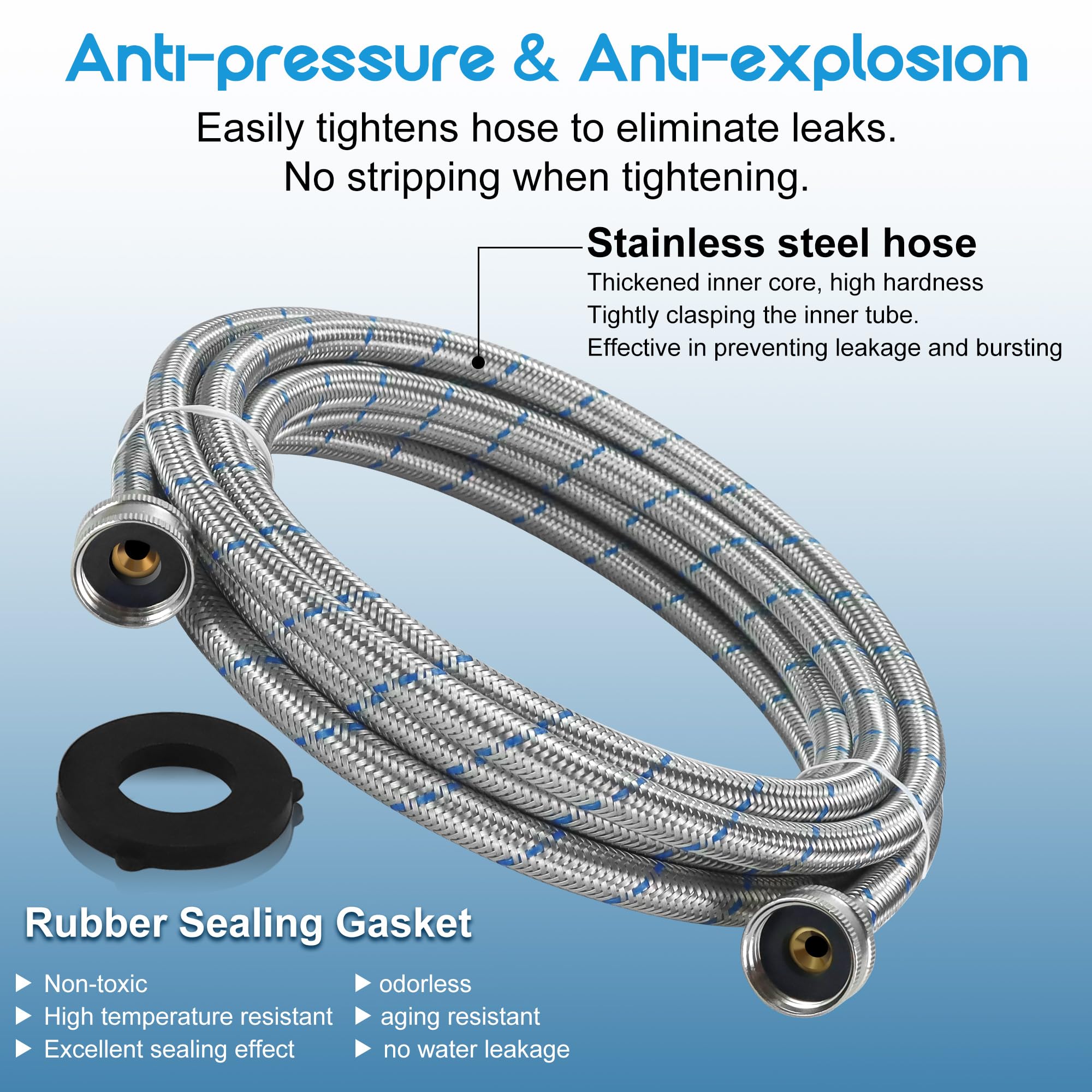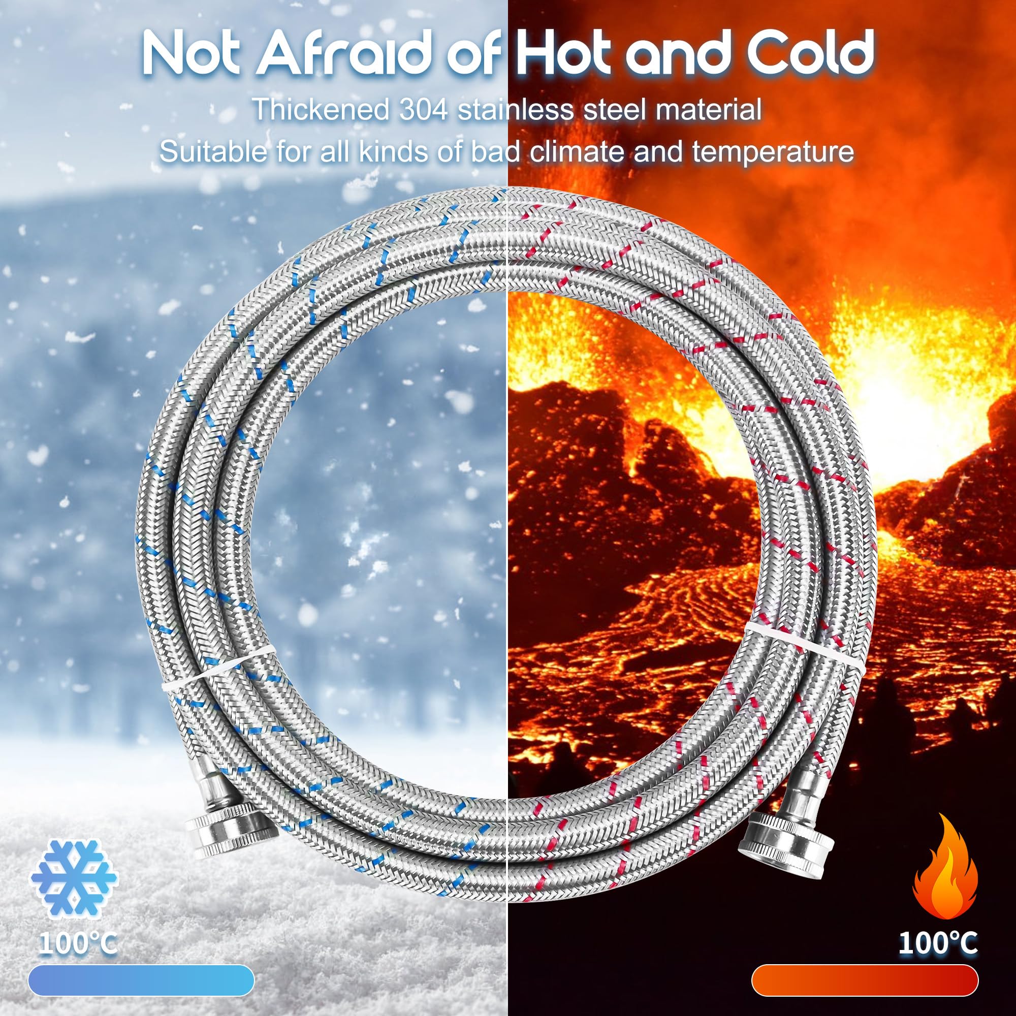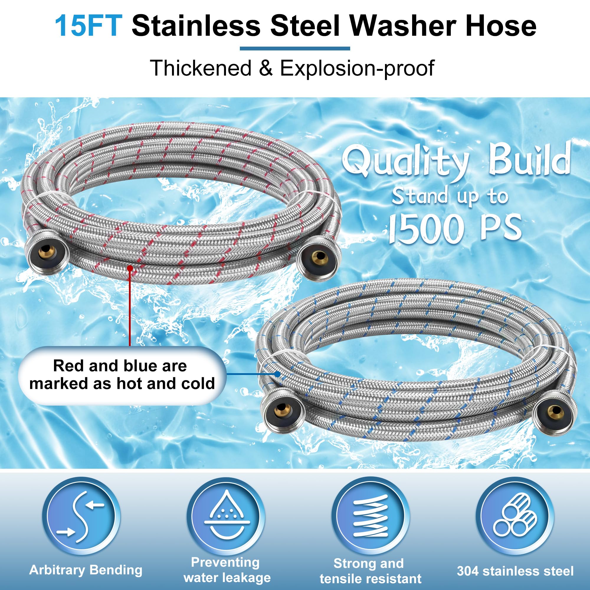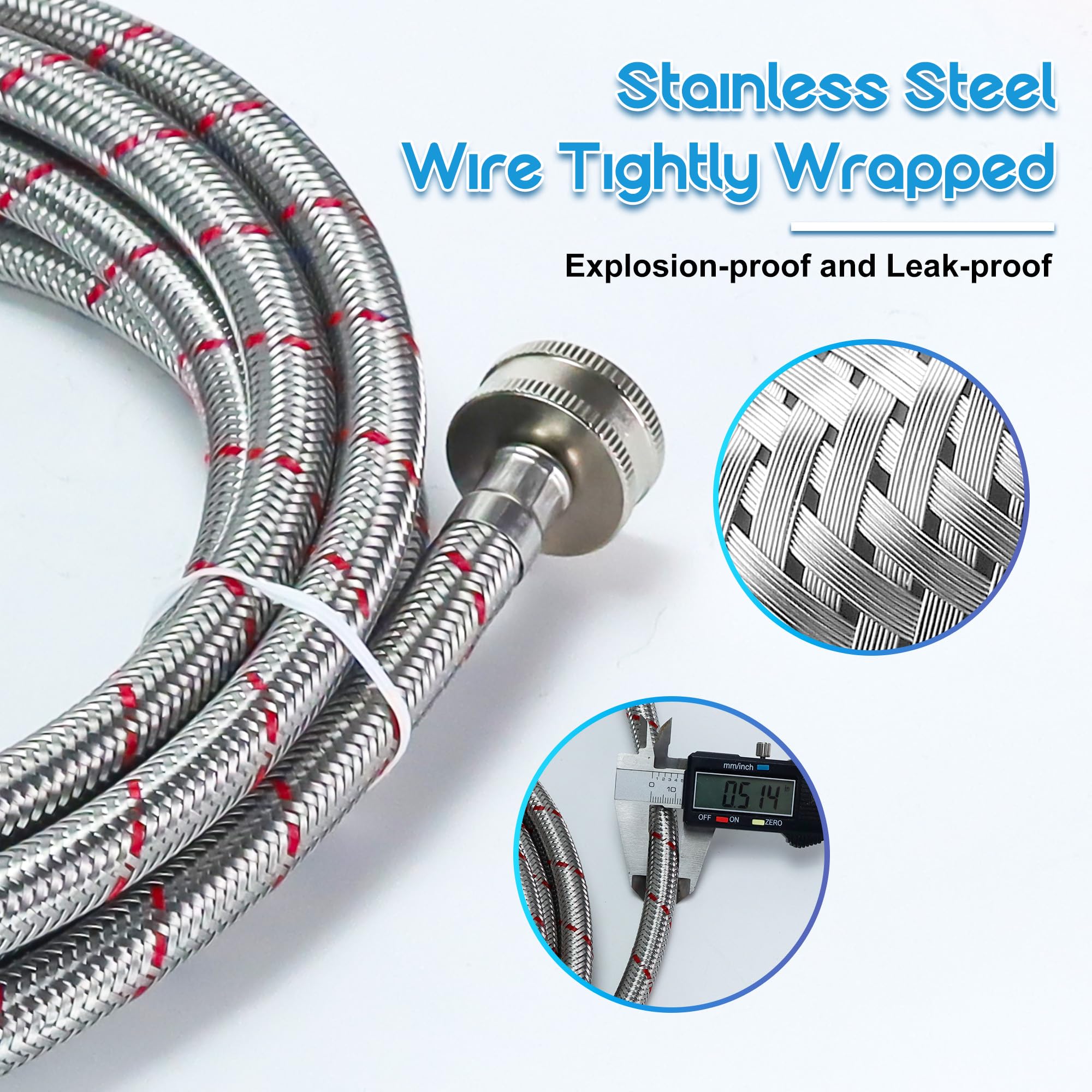 ใ๐ฆ๐ฎ๐ณ๐ฒ & ๐๐๐ฟ๐๐-๐ฝ๐ฟ๐ผ๐ผ๐ณใThe 15ft stainless steel washing machine supply hoses are made of no-lead 304 stainless steel braided outer protection cover, which has a high metal hardness, enabling it to withstand high water pressure. Even when faced with fluctuations in water pressure during washing machine operation, this stainless steel washer hose is unlikely to deform or burst