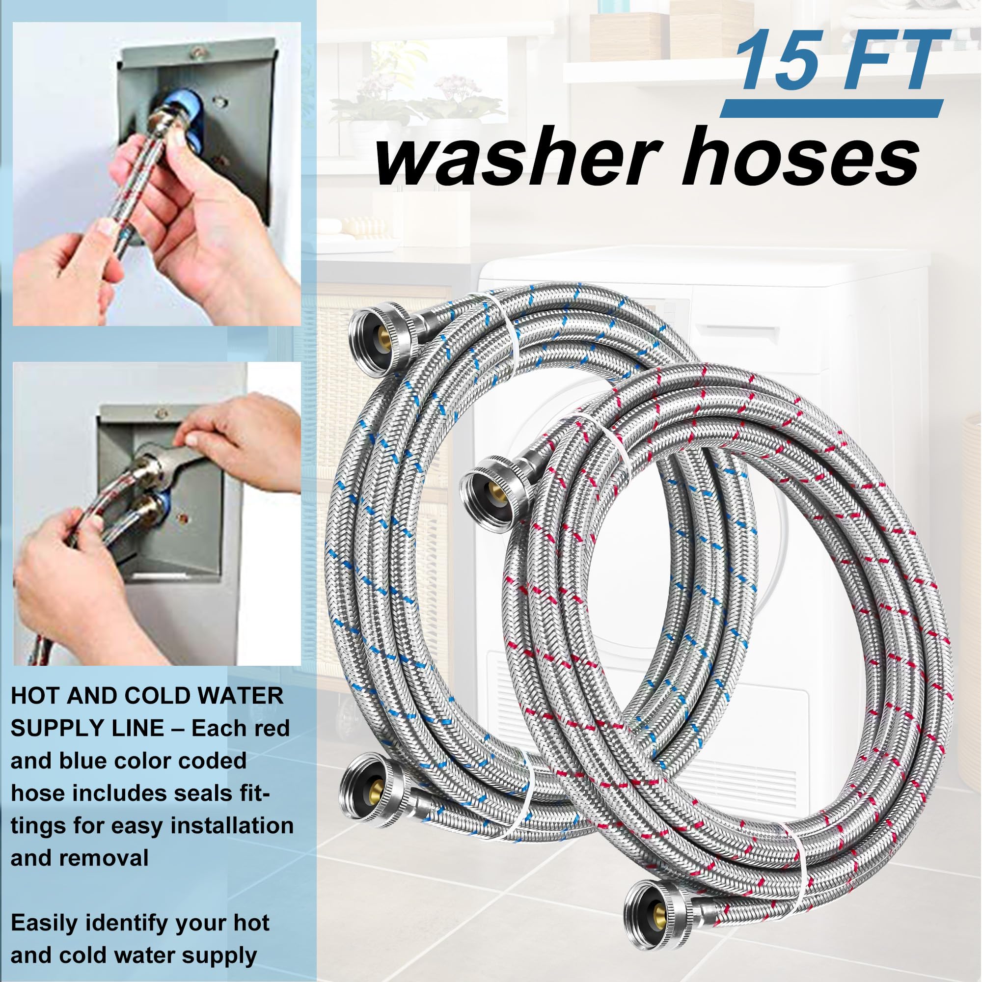 ใ๐ญ๐ฑ๐๐ง ๐๐ผ๐ป๐ด ๐ช๐ฎ๐๐ต๐ฒ๐ฟ ๐๐ผ๐๐ฒ๐ใEach package includes 2 x 15FT Stainless Steel Washing Machine Hoses with 3/4'' Standard NPT for hot and cold water supply. Compared to short size of washer hoses, our 15-foot washing machine hoses have a wider range of use and is suitable for long distance connections