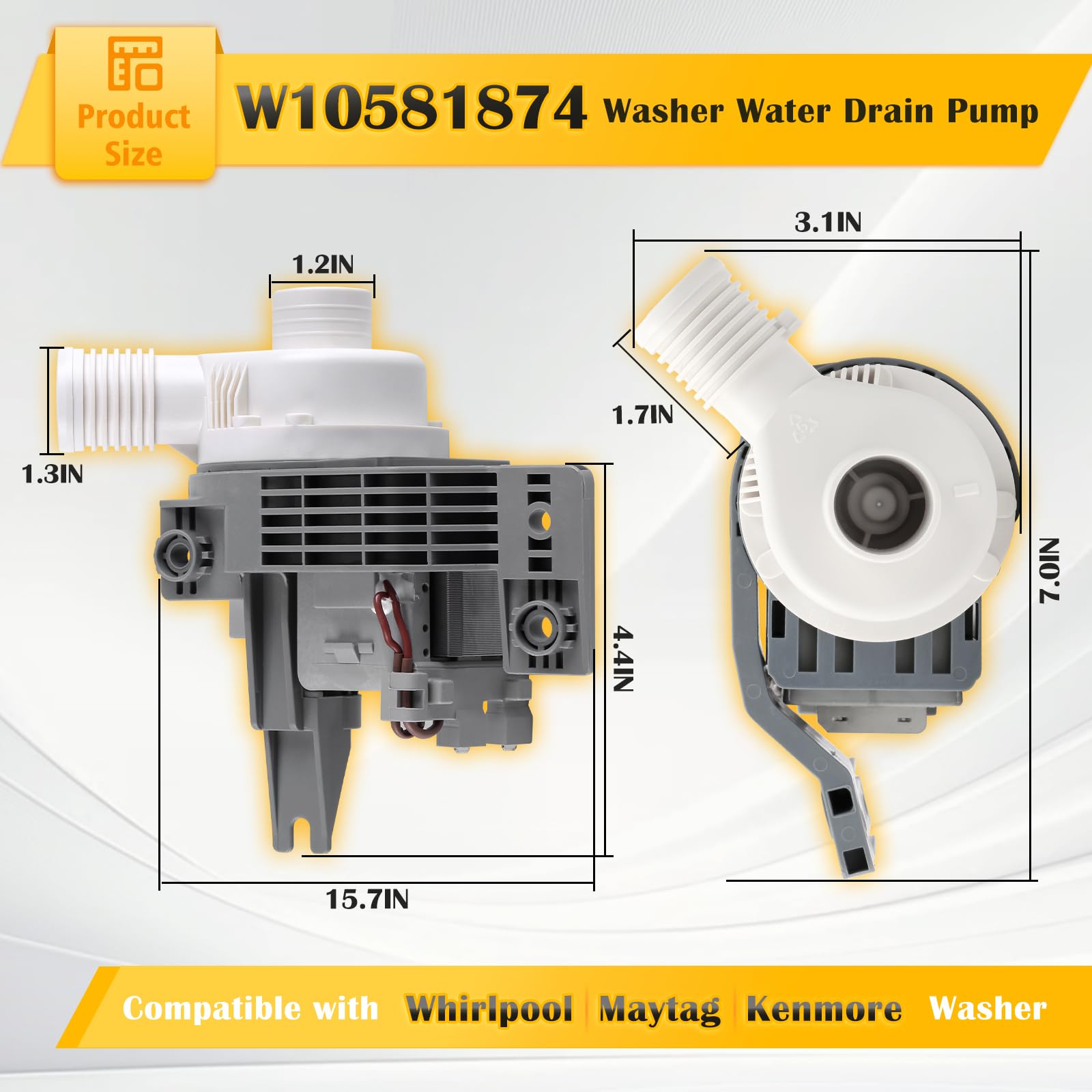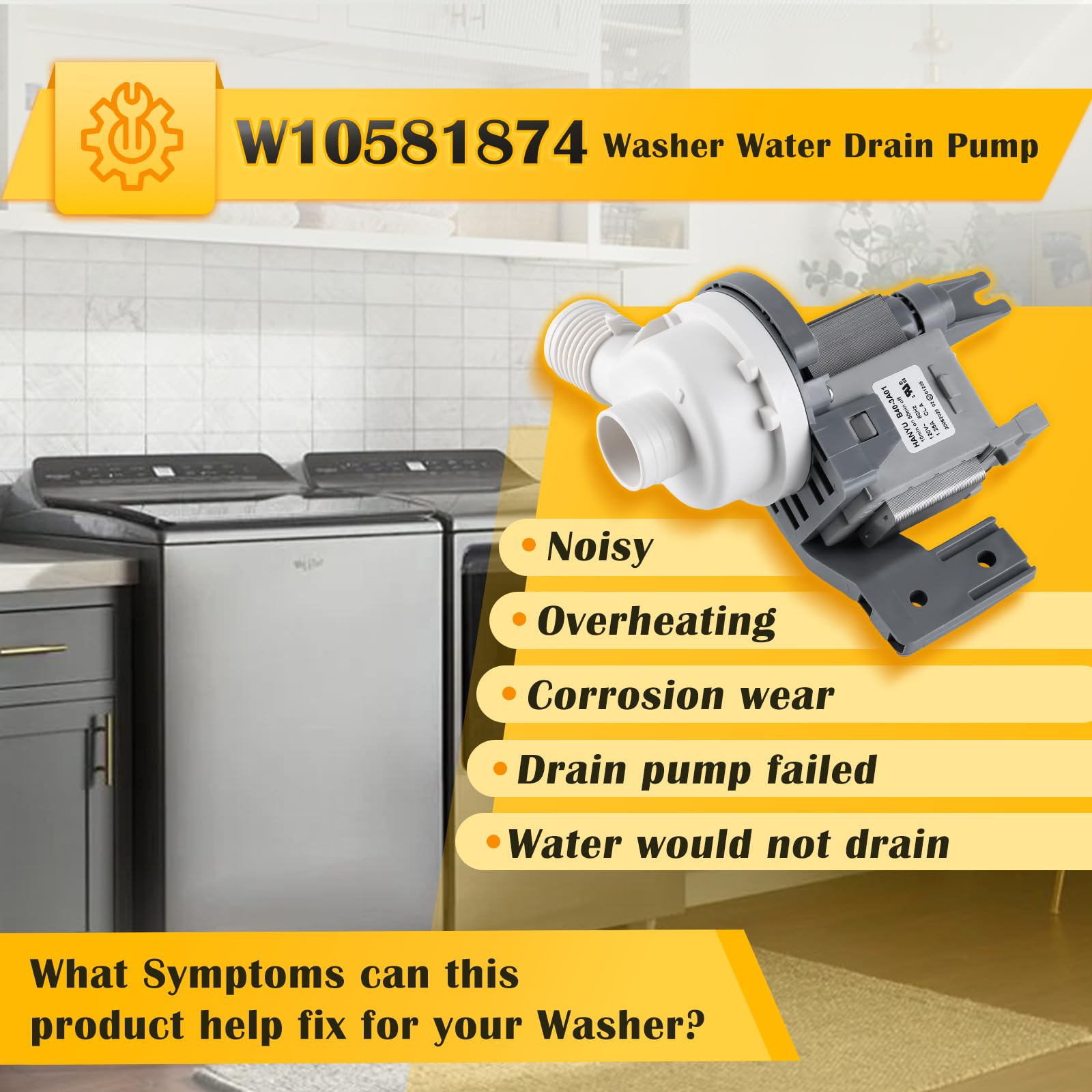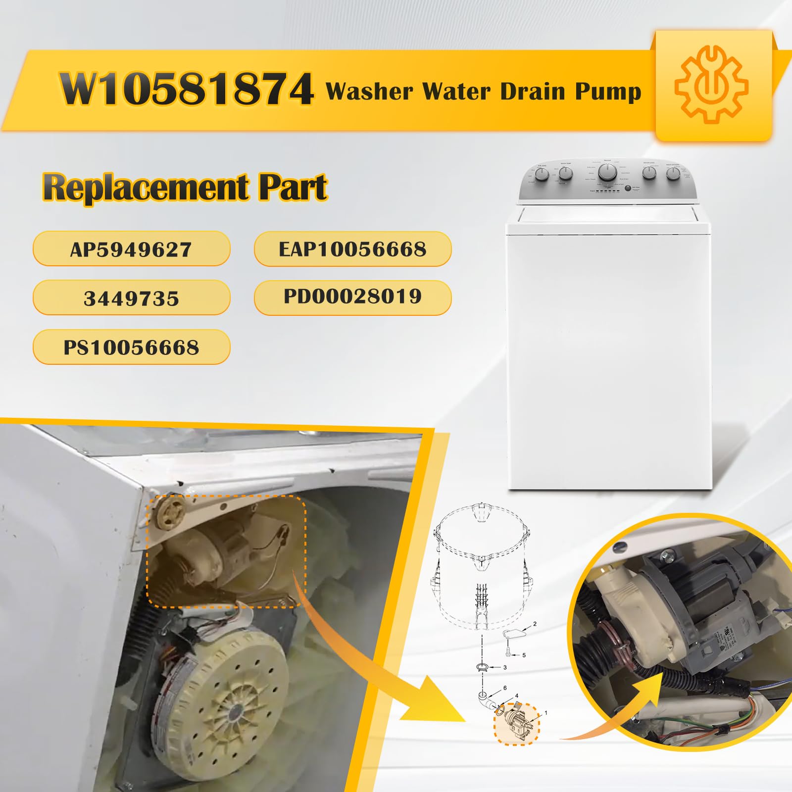【Replaceable Models】 This W10581874 Washer Water Drain Pump replaces the following part numbers: W10581874, AP5949627, 3449735, PS10056668, EAP10056668, PD00028019