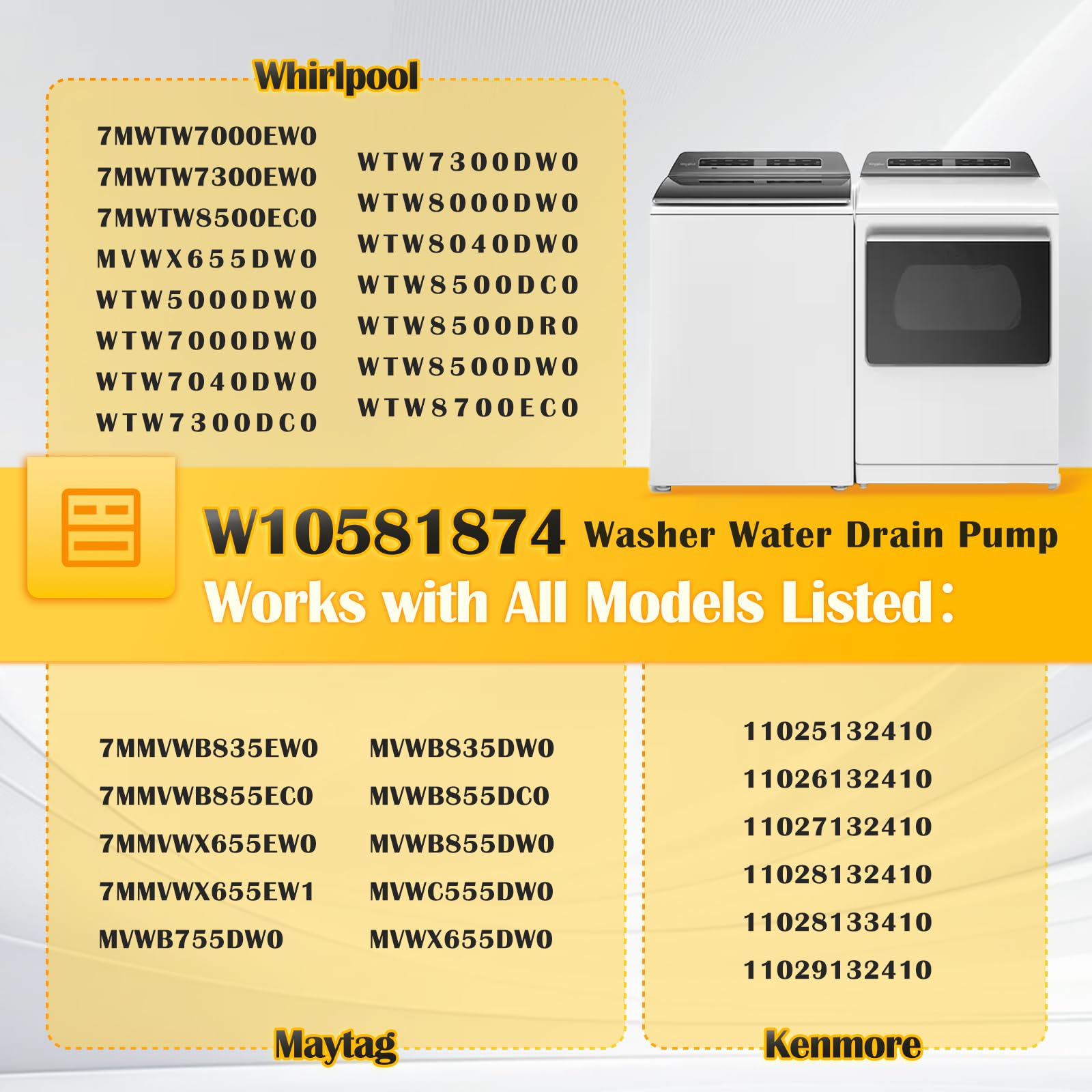 【Compatible Brands & Models】 Perfectly compatible with Whirlpool, Maytag, and Kenmore washers, including models: Whirlpool: 7MWTW7000EW0, 7MWTW7300EW0, 7MWTW8500EC0, MVWX655DW0, WTW5000DW0, WTW7000DW0, WTW7040DW0, WTW7300DC0, WTW7300DW0, WTW8000DW0, WTW8040DW0, WTW8500DC0, WTW8500DR0, WTW8500DW0, WTW8700EC0 Maytag: 7MMVWB835EW0, 7MMVWB855EC0, 7MMVWX655EW0, 7MMVWX655EW1, MVWB755DW0, MVWB835DW0, MVWB855DC0, MVWB855DW0, MVWC555DW0, MVWX655DW0 Kenmore: 11025132410, 11026132410, 11027132410, 11028132410, 11028133410, 11029132410, 11029133410 Unsure about compatibility? Contact us with your washer model for confirmation
