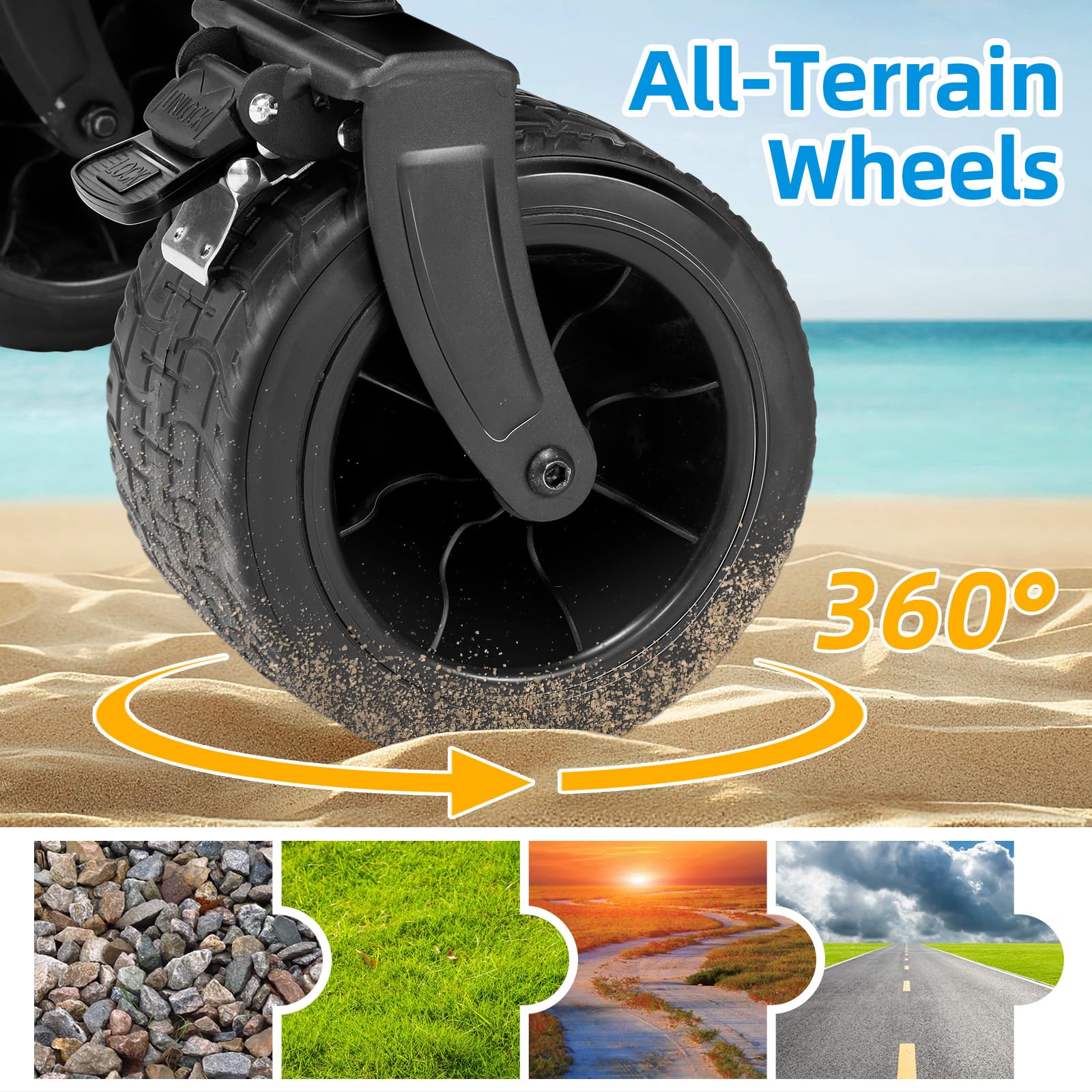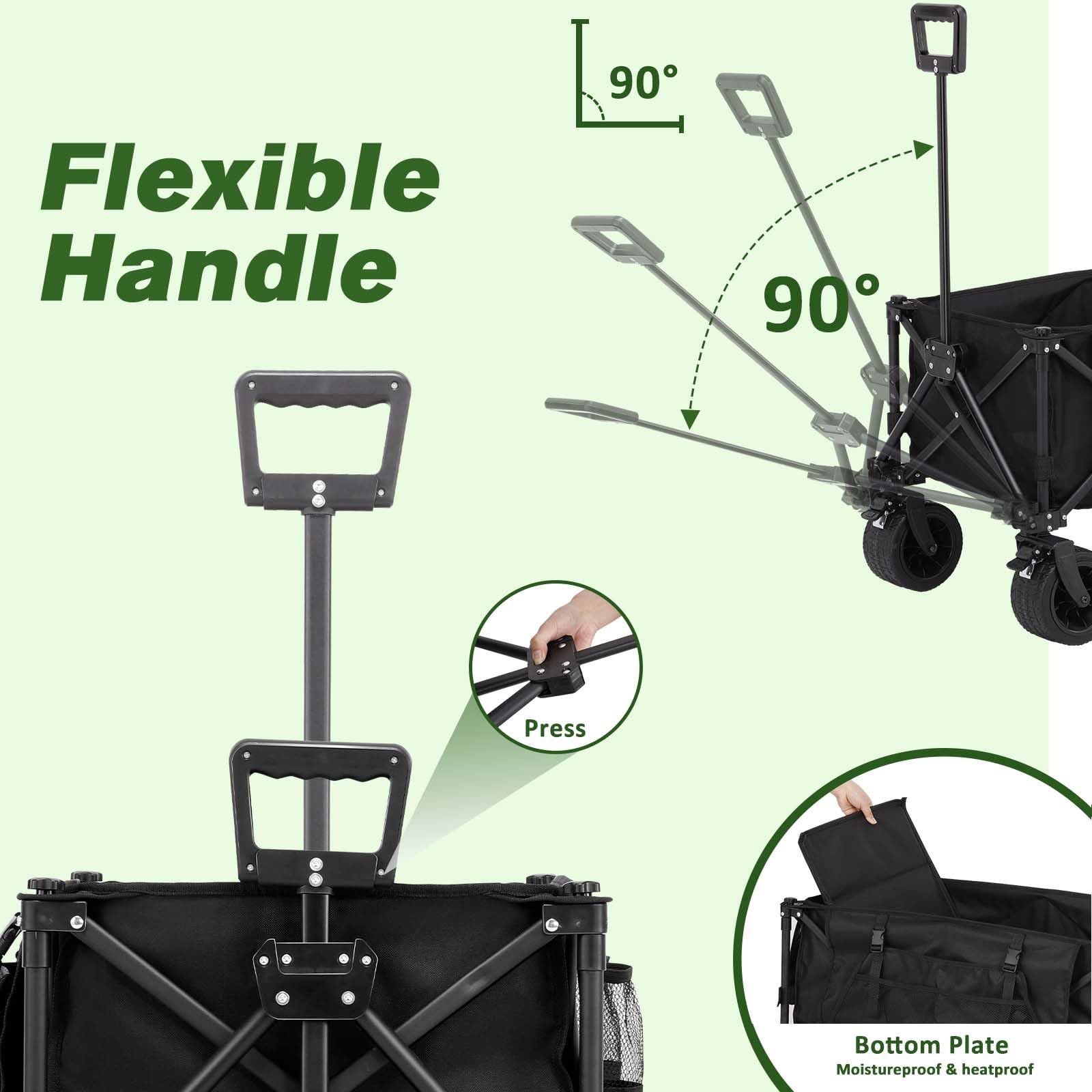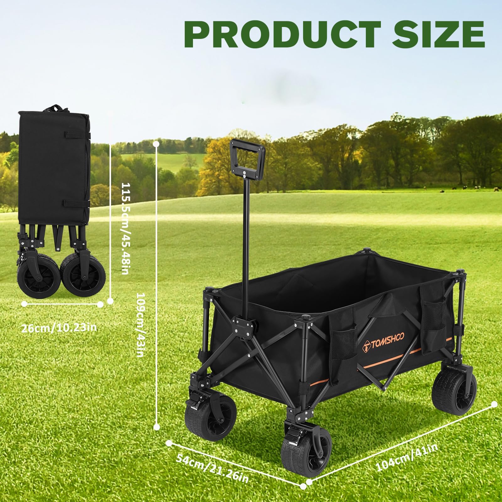 【4-inch Wide Universal Wheels】: TOMSHOO beach wagon with 7"x 4" wide 360° rotation front wheels are an outstanding feature of this garden cart, it can be easily used in lawn, forest, beach. The wheels have locks to keep it from rolling away.