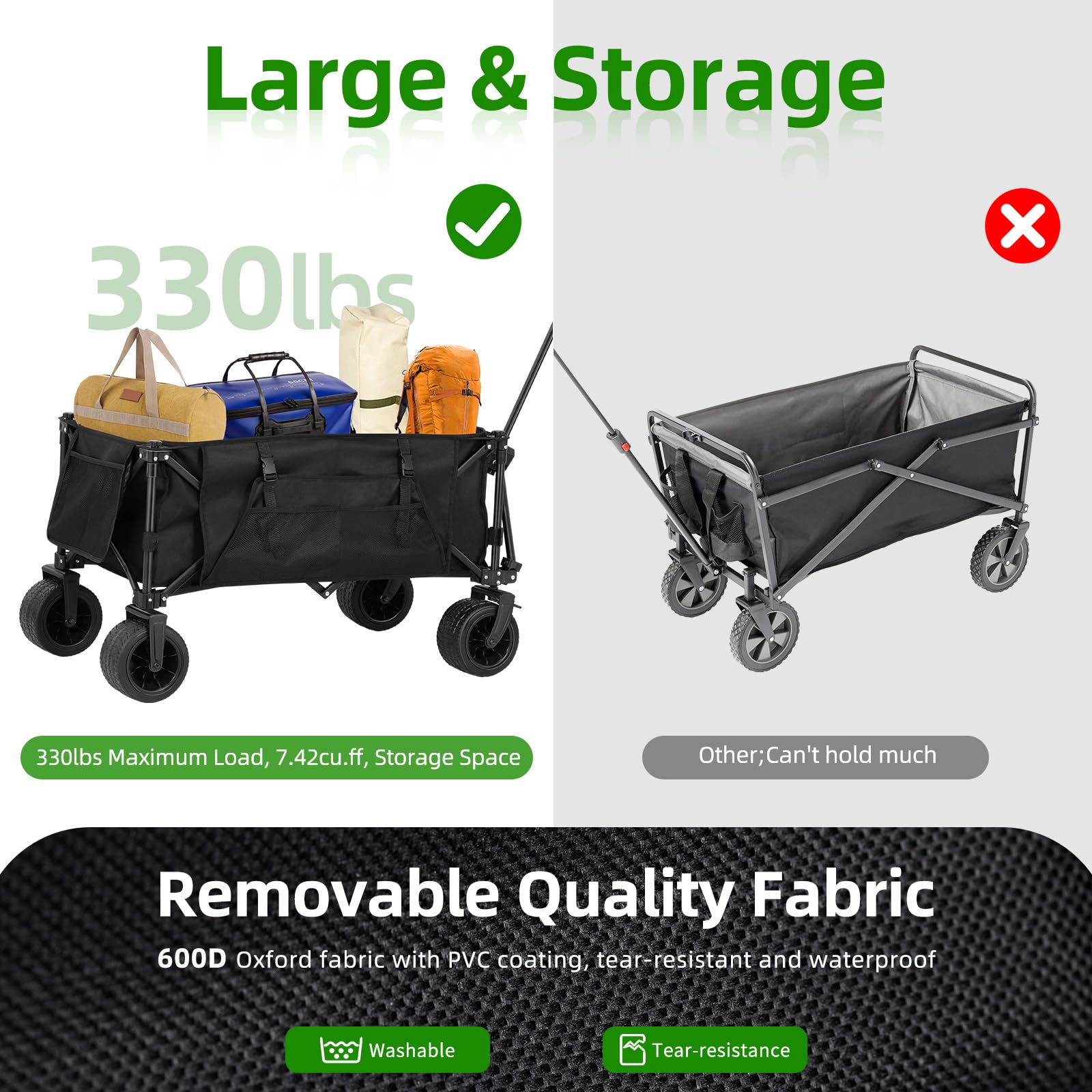 【Handy Heavy Duty Cart】: Collapsible wagon ready to use right out of the box, saving you time and effort. The fabric is 600D Oxford fabric and PVC material, waterproof and tear-resistant. Large wheels and framing made it sturdy and 330LB handles the weight of multiple bags piled in and on it. Make your outdoor adventures much more enjoyable and stress-free.